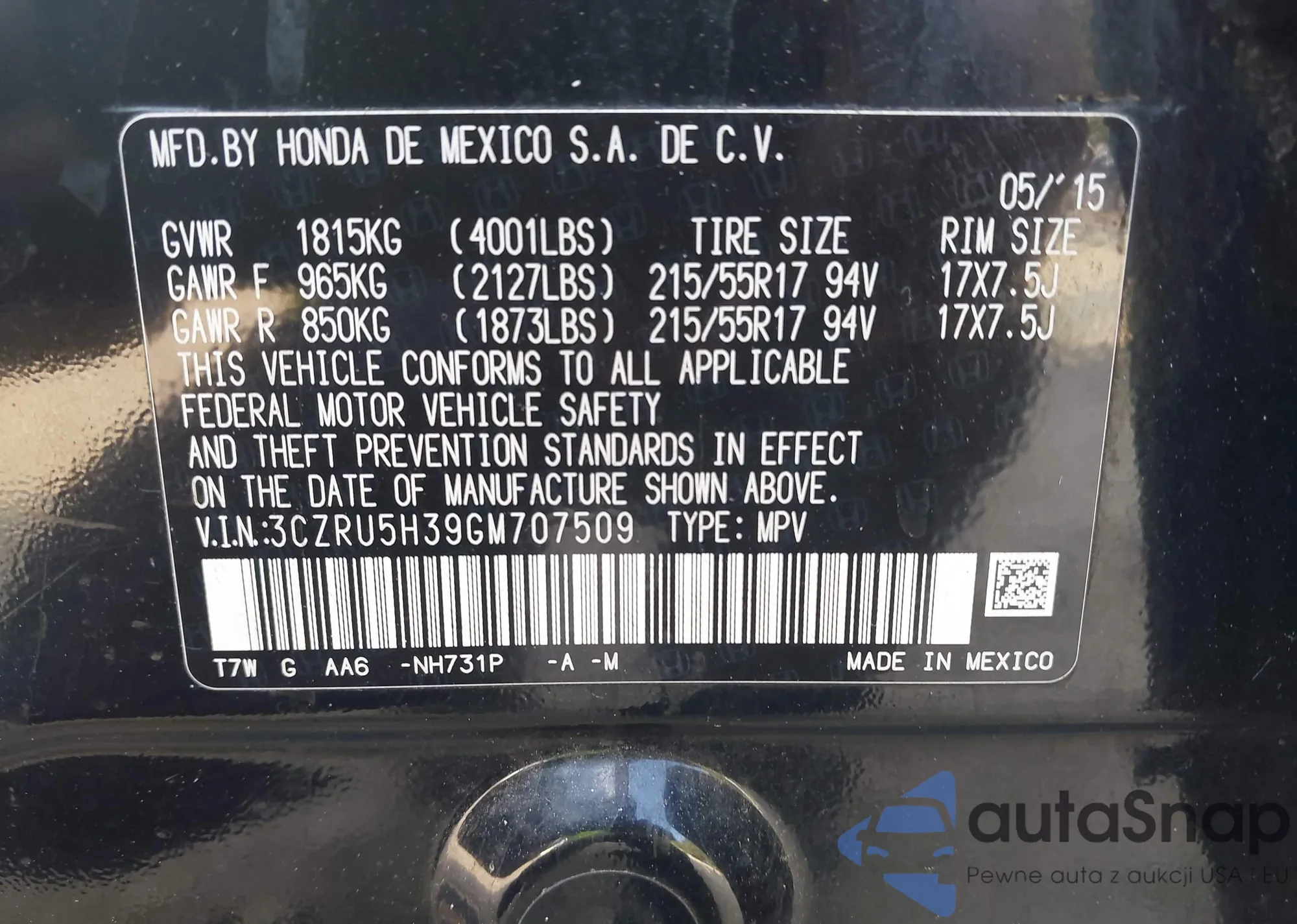 Автомобиль Honda HR-V 2016 (VIN 3CZRU5H39GM707509) ранее не участвовал в торгах. Документы чистые, пробег соответствует или ниже среднего по рынку. Продаётся страховой компанией — рекомендуем покупку. Доставка в порт займет около 6–8 недель.