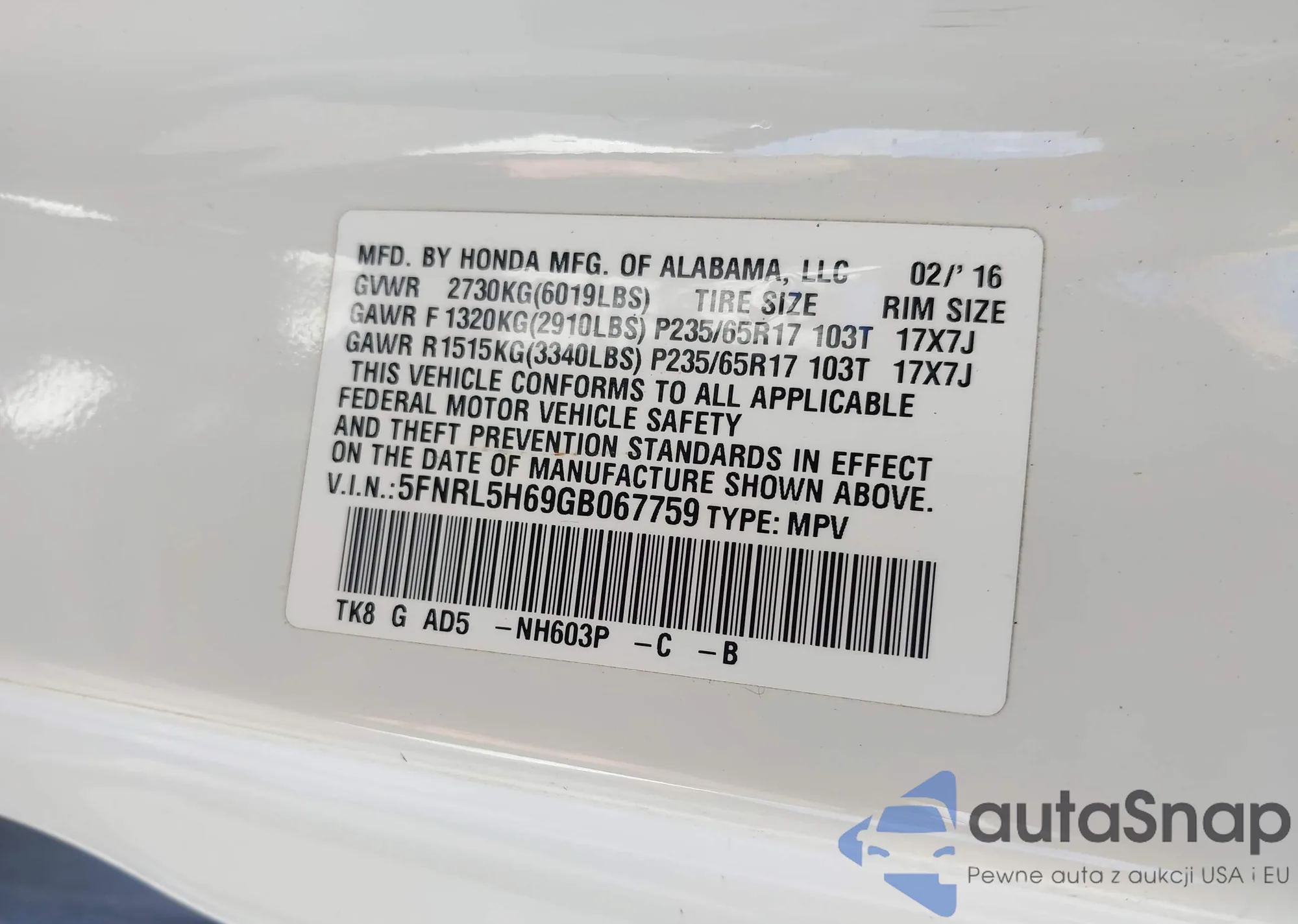 VIN: 5FNRL5H69GB067759