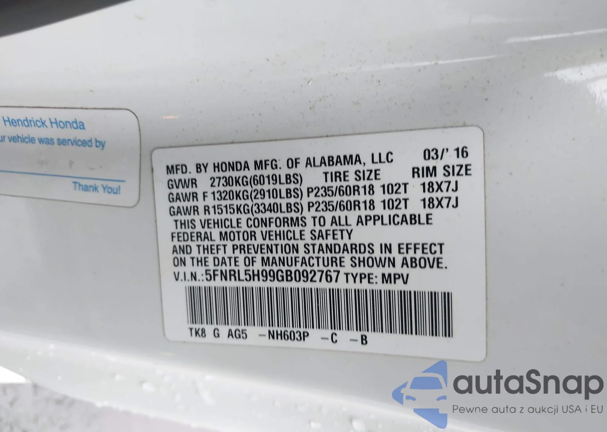VIN: 5FNRL5H99GB092767