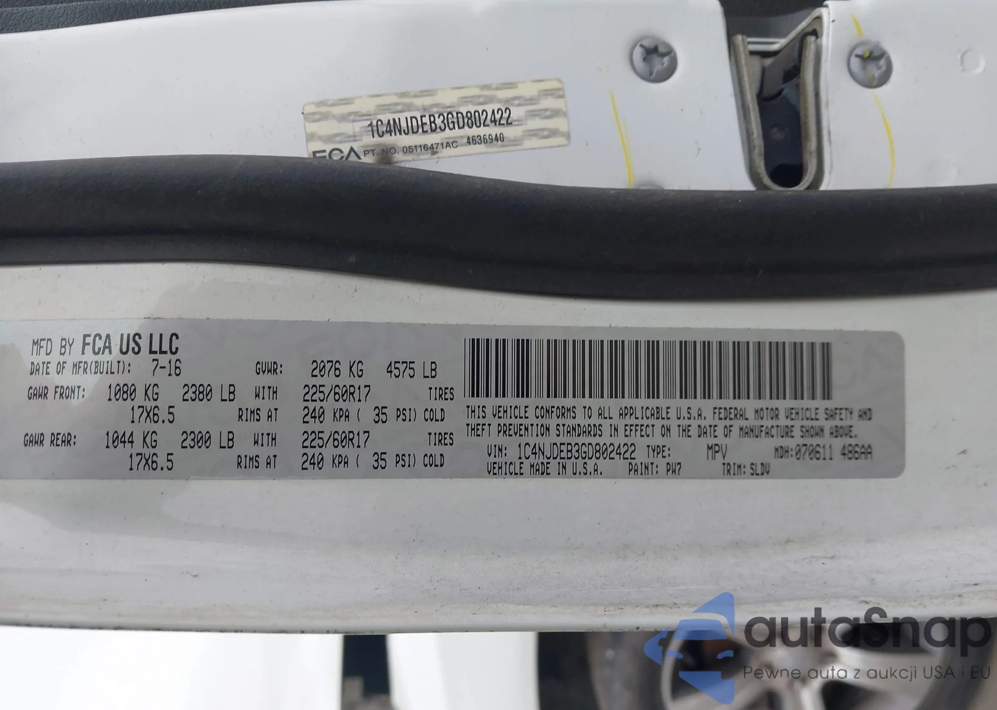 Автомобиль Jeep Compass 2016 (VIN 1C4NJDEB3GD802422) ранее не участвовал в торгах. Документы чистые, пробег соответствует или ниже среднего по рынку. Продаётся страховой компанией — рекомендуем покупку. Доставка в порт займет около 6–8 недель.