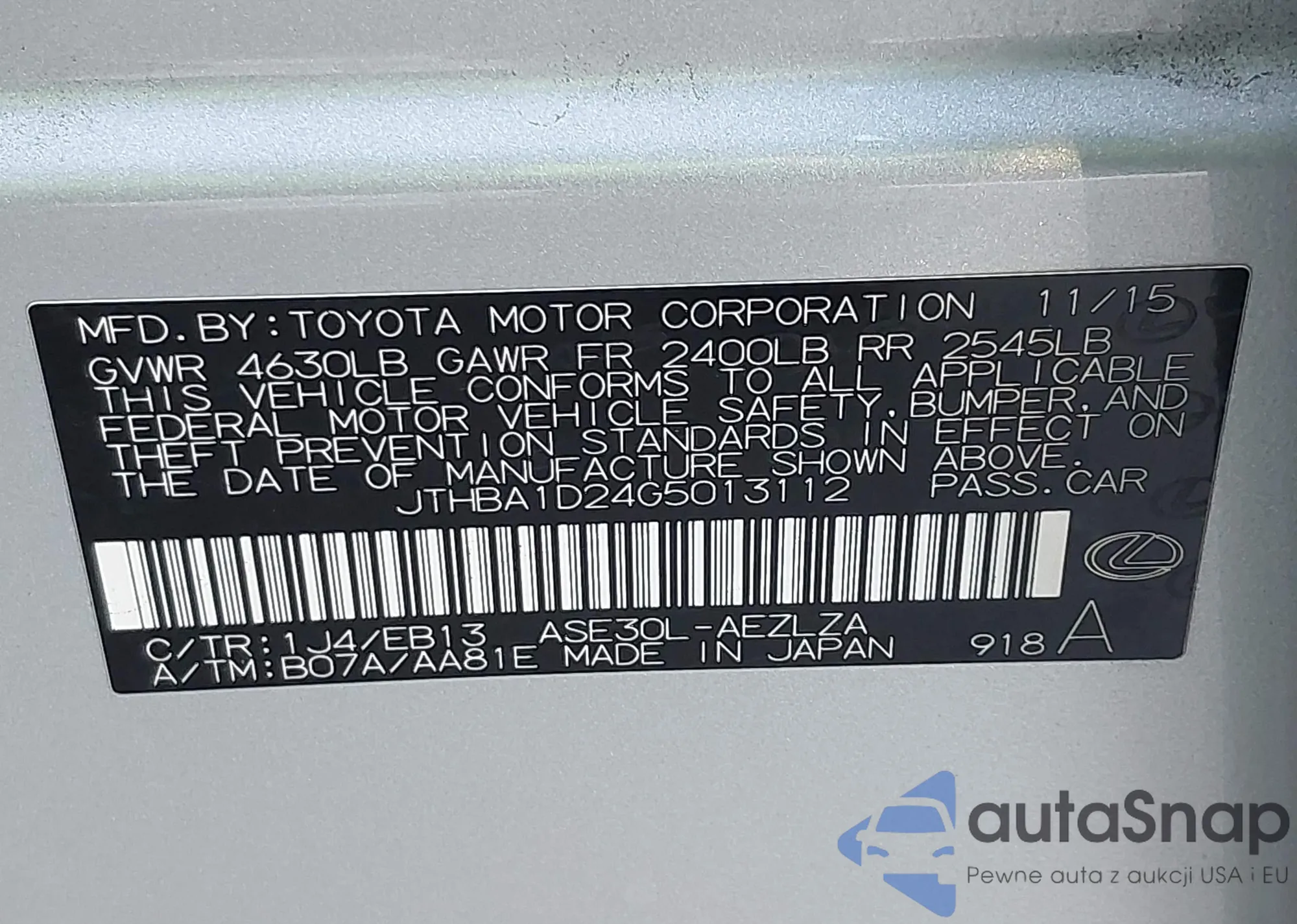 Автомобиль Lexus IS 2016 (VIN JTHBA1D24G5013112) ранее не участвовал в торгах. Документы чистые, пробег соответствует или ниже среднего по рынку. Продаётся страховой компанией — рекомендуем покупку. Доставка в порт займет около 6–8 недель.