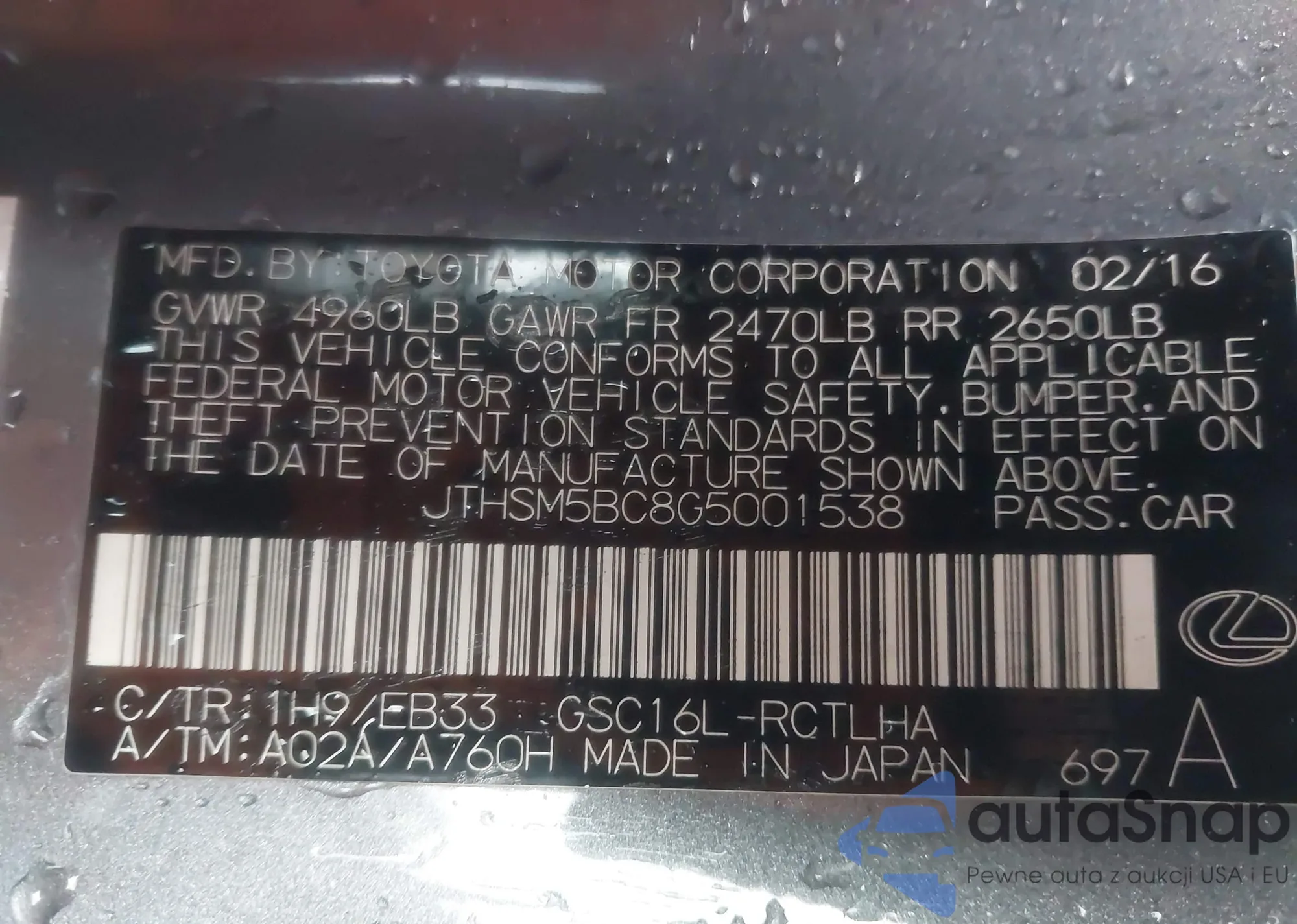 Автомобиль Lexus RC 2016 (VIN JTHSM5BC8G5001538) имеет документы, препятствующие регистрации. Могут возникнуть сложности при экспорте и регистрации. Обратитесь к экспертам AutaSnap для поиска альтернатив.