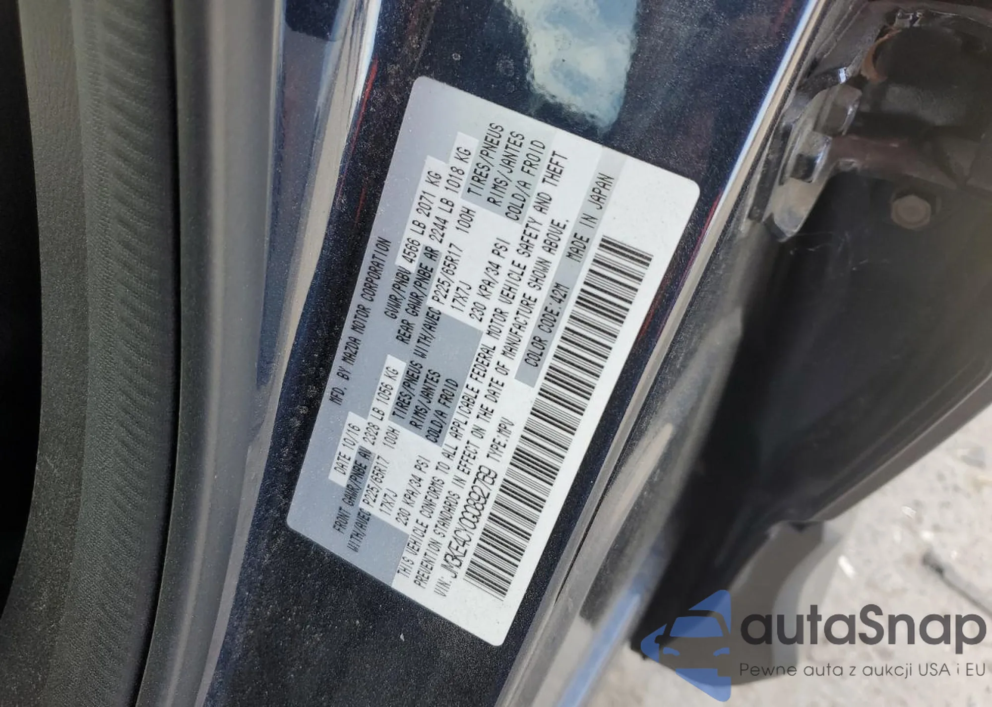 Автомобиль Mazda CX-5 2016 (VIN JM3KE4CY0G0892769) имеет документы, препятствующие регистрации. Могут возникнуть сложности при экспорте и регистрации. Обратитесь к экспертам AutaSnap для поиска альтернатив.