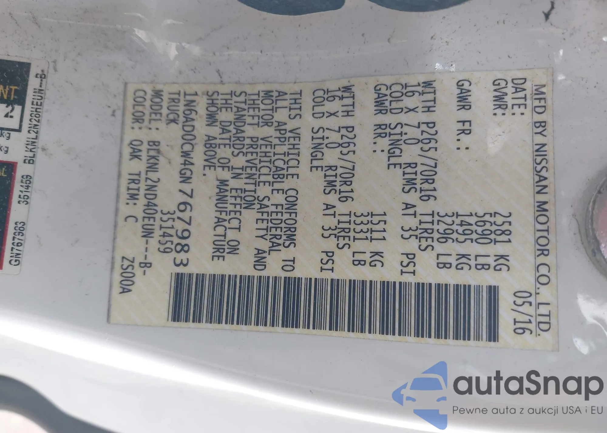 Автомобиль Nissan Navara (Frontier) 2016 (VIN 1N6AD0CW4GN767983) ранее не участвовал в торгах. Документы чистые, пробег соответствует или ниже среднего по рынку. Продаётся страховой компанией — рекомендуем покупку. Доставка в порт займет около 6–8 недель.