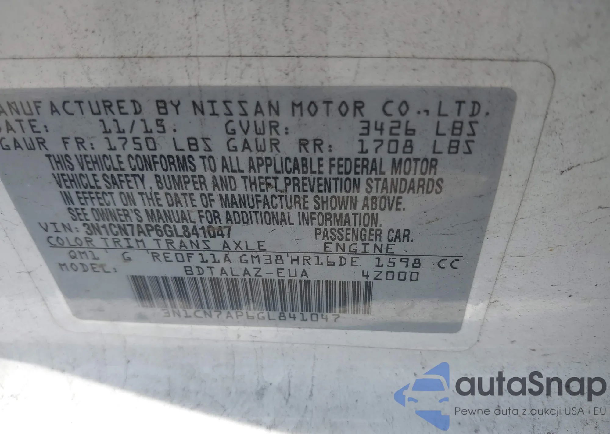 VIN: 3N1CN7AP6GL841047