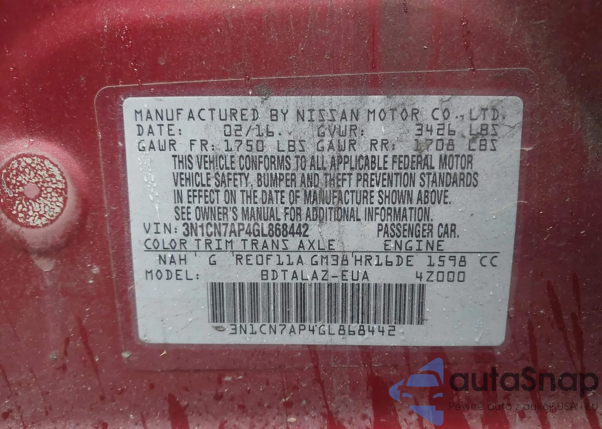 Автомобиль Nissan Versa 2016 (VIN 3N1CN7AP4GL868442) ранее не участвовал в торгах. Документы чистые, пробег соответствует или ниже среднего по рынку. Продаётся страховой компанией — рекомендуем покупку. Доставка в порт займет около 6–8 недель.