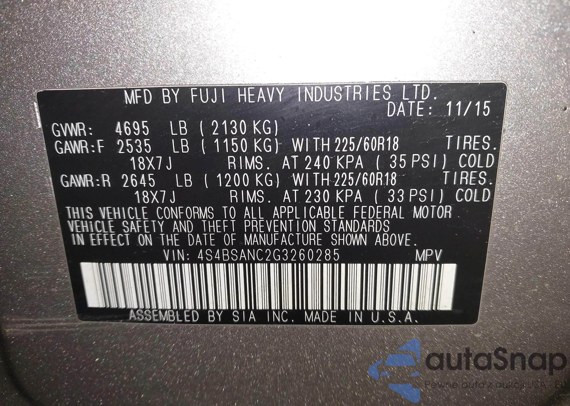 Subaru Outback 2016 – История автомобиля (продан на IAAI)