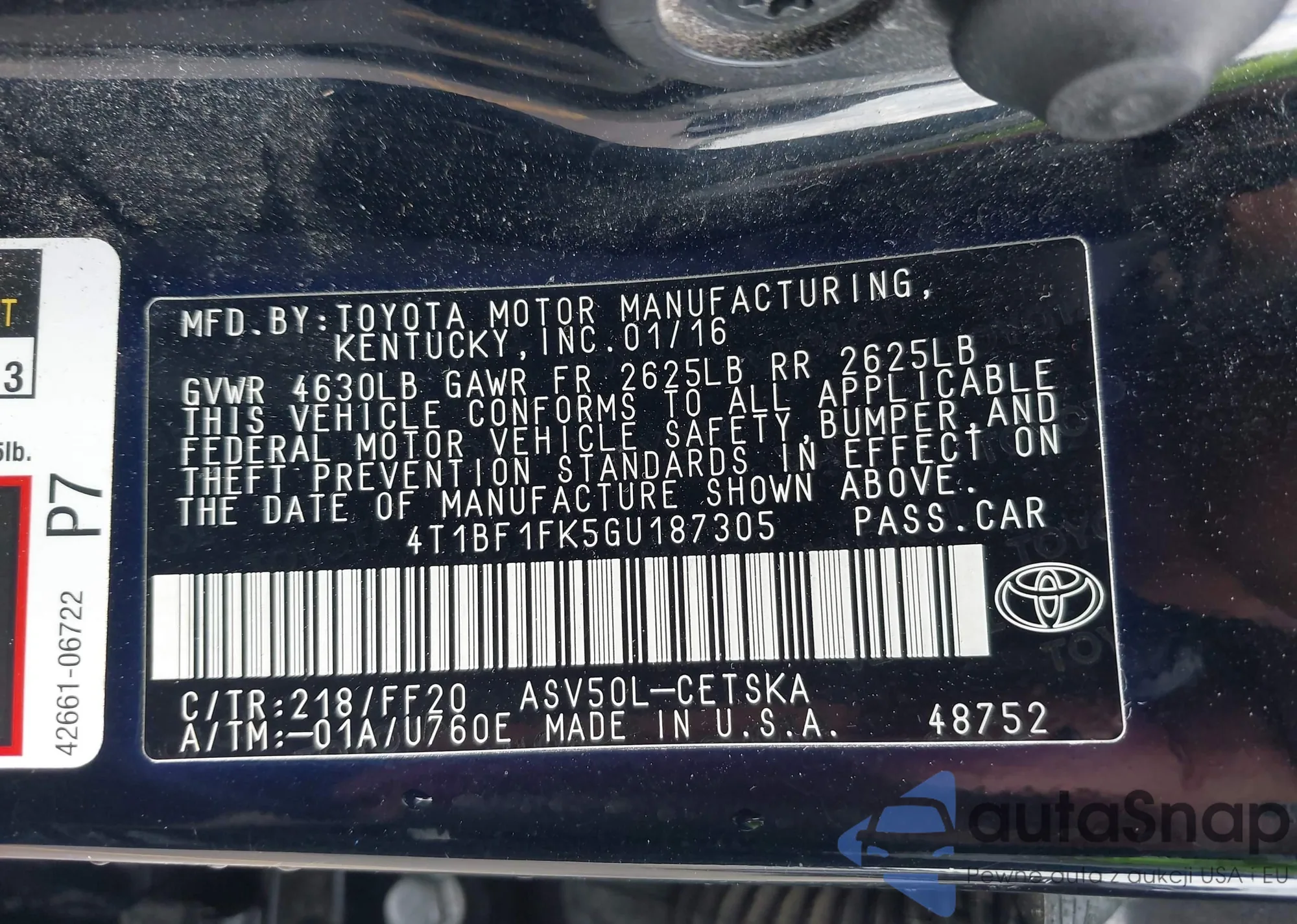 VIN: 4T1BF1FK5GU187305