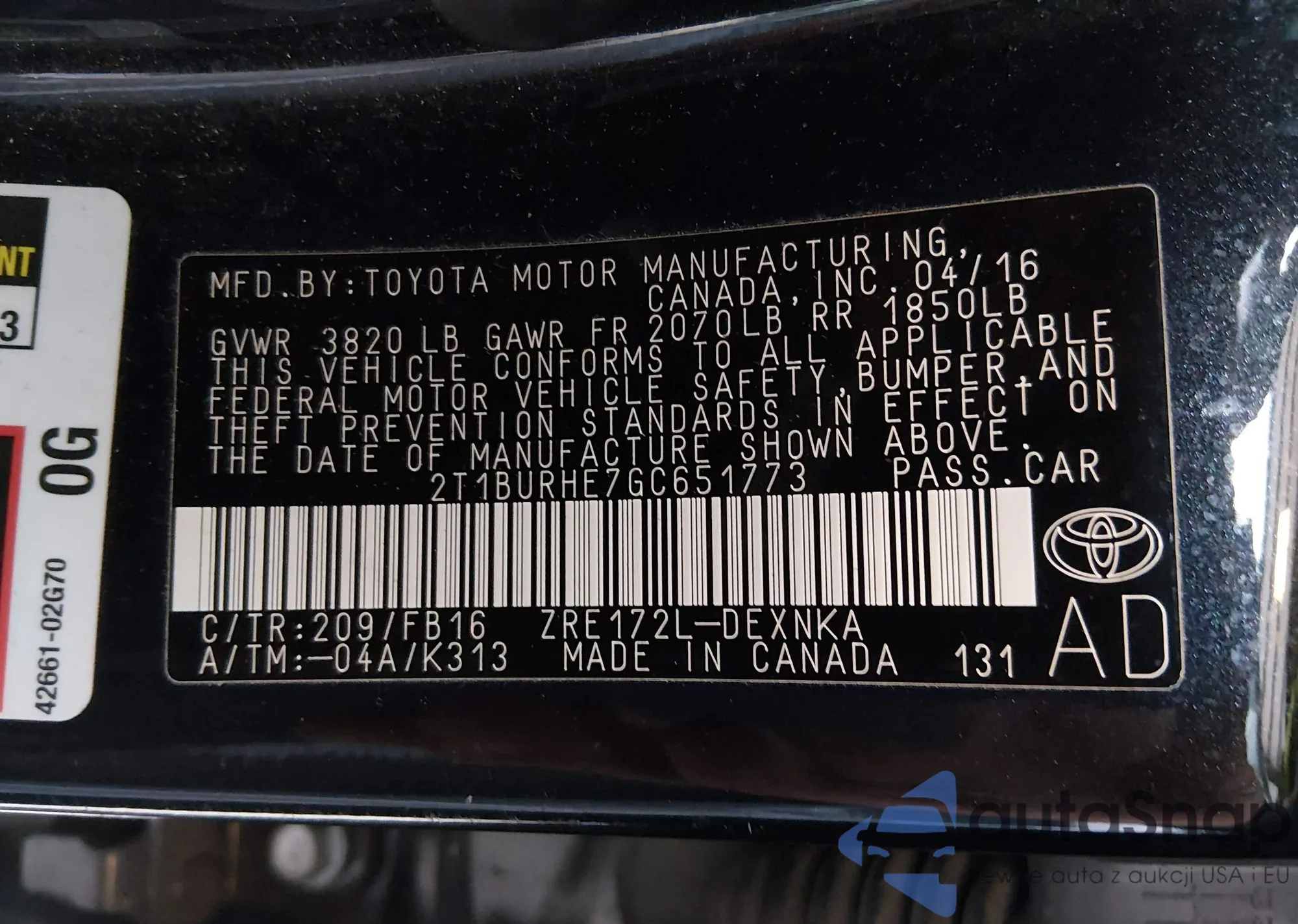 Автомобиль Toyota Corolla 2016 (VIN 2T1BURHE7GC651773) имеет документы, препятствующие регистрации. Могут возникнуть сложности при экспорте и регистрации. Обратитесь к экспертам AutaSnap для поиска альтернатив.