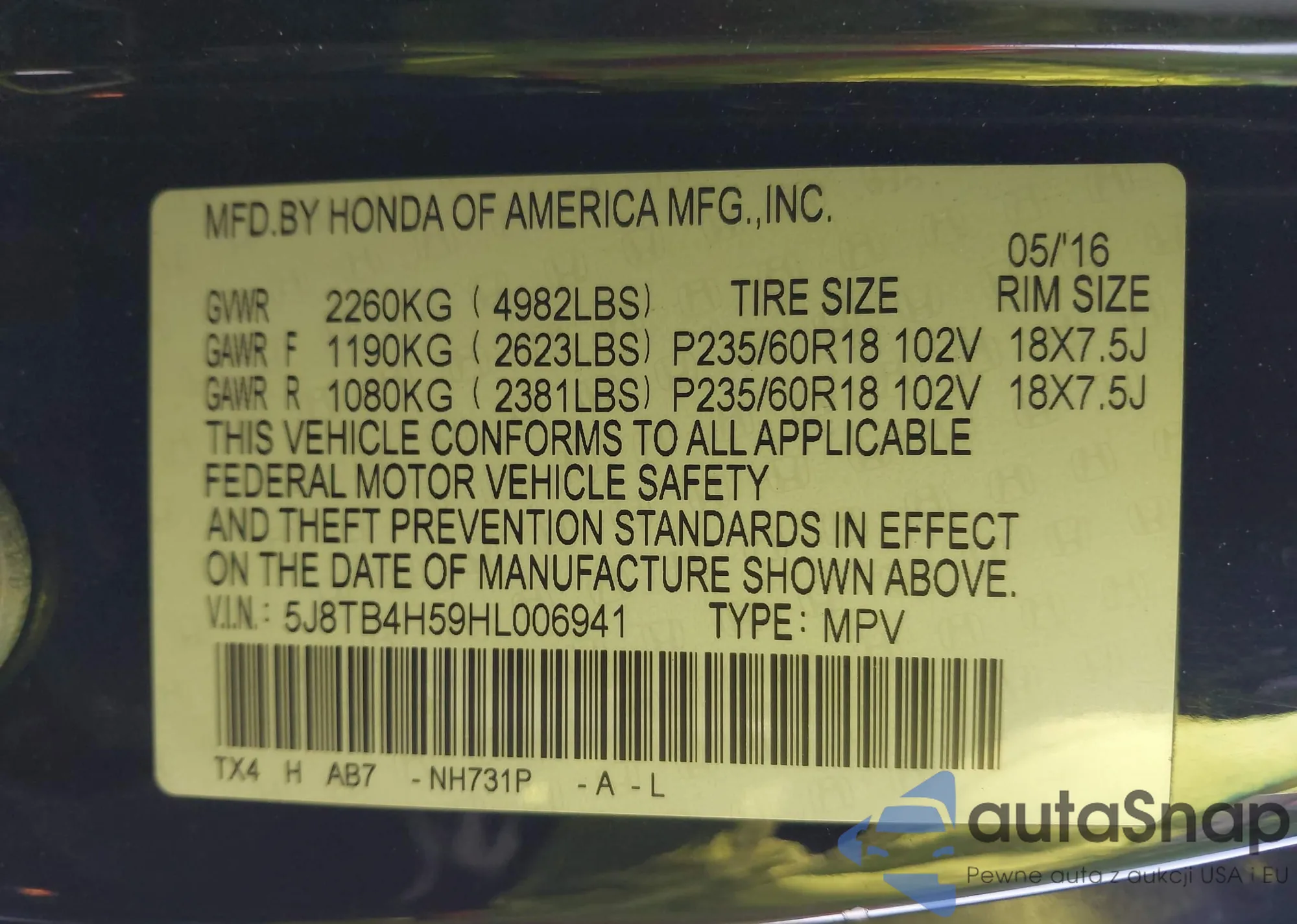 • VIN: 5J8TB4H59HL006941