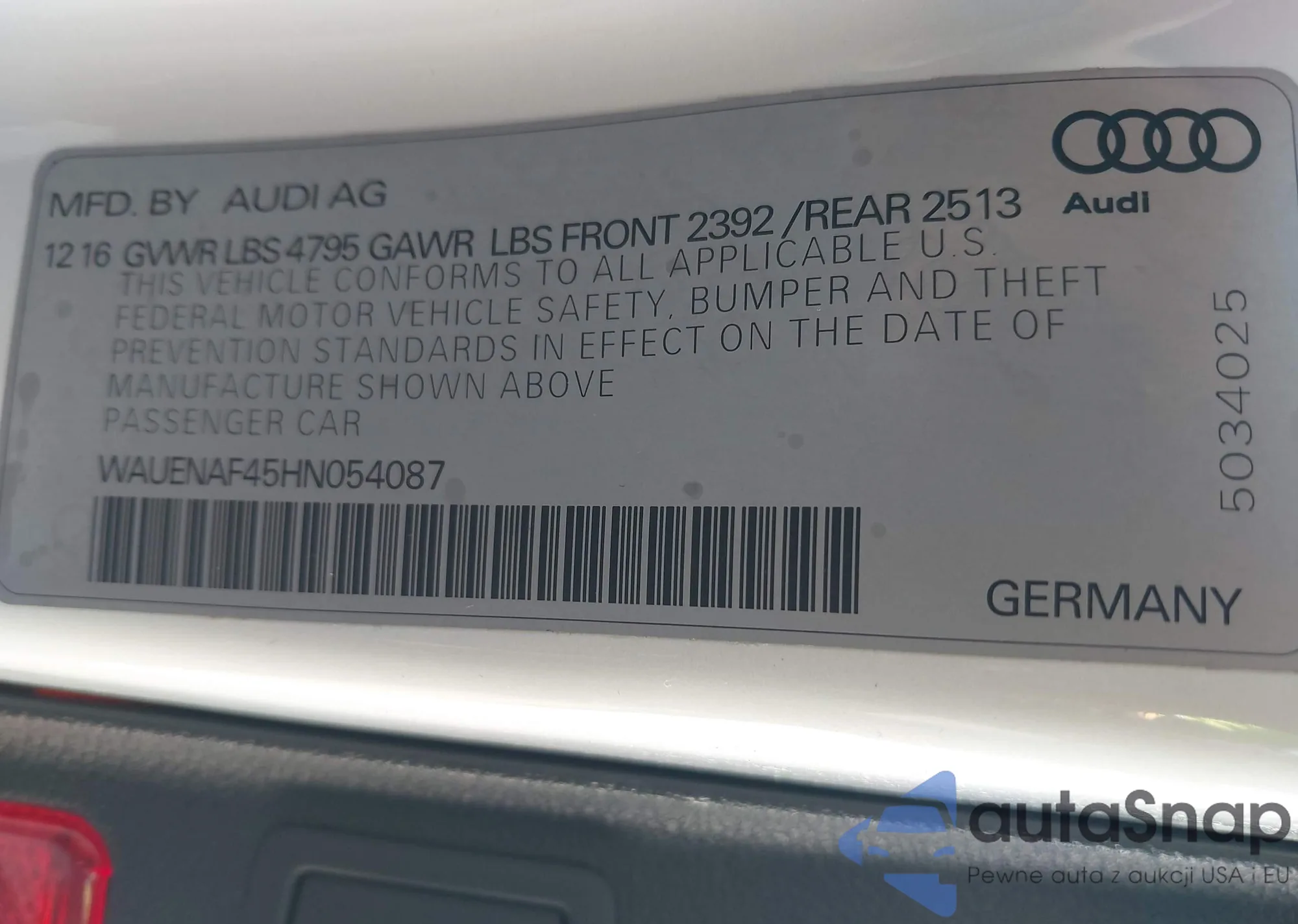 Автомобиль Audi A4 2017 (VIN WAUENAF45HN054087) ранее не участвовал в торгах. Документы чистые, пробег соответствует или ниже среднего по рынку. Продаётся страховой компанией — рекомендуем покупку. Доставка в порт займет около 6–8 недель.