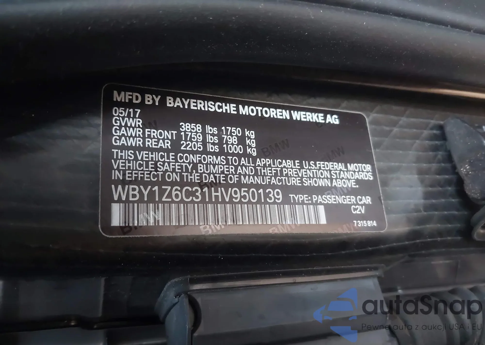 Автомобиль BMW i3 2017 (VIN WBY1Z6C31HV950139) имеет документы, препятствующие регистрации. Могут возникнуть сложности при экспорте и регистрации. Обратитесь к экспертам AutaSnap для поиска альтернатив.