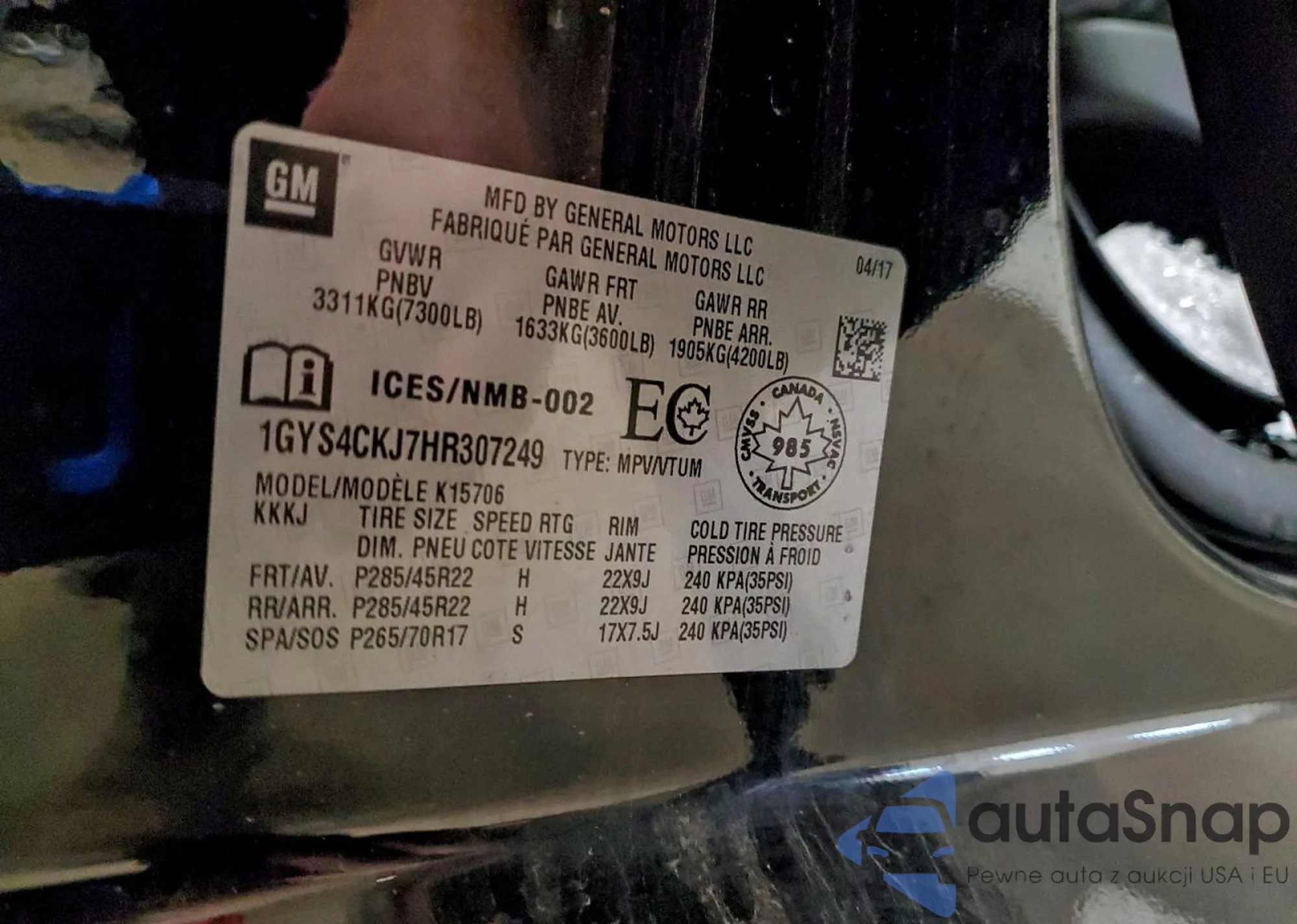 VIN: 1GYS4CKJ7HR307249