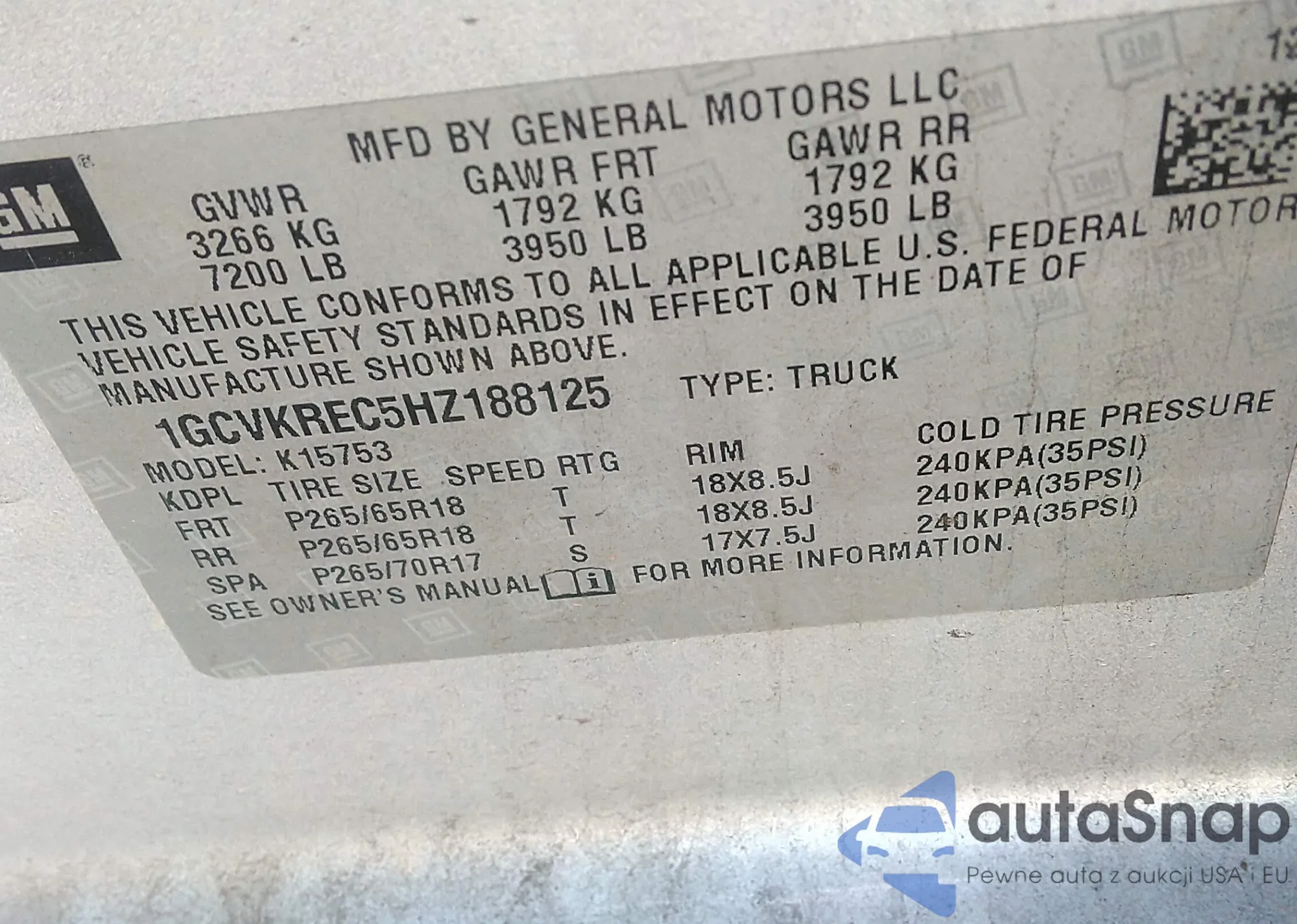 VIN: 1GCVKREC5HZ188125