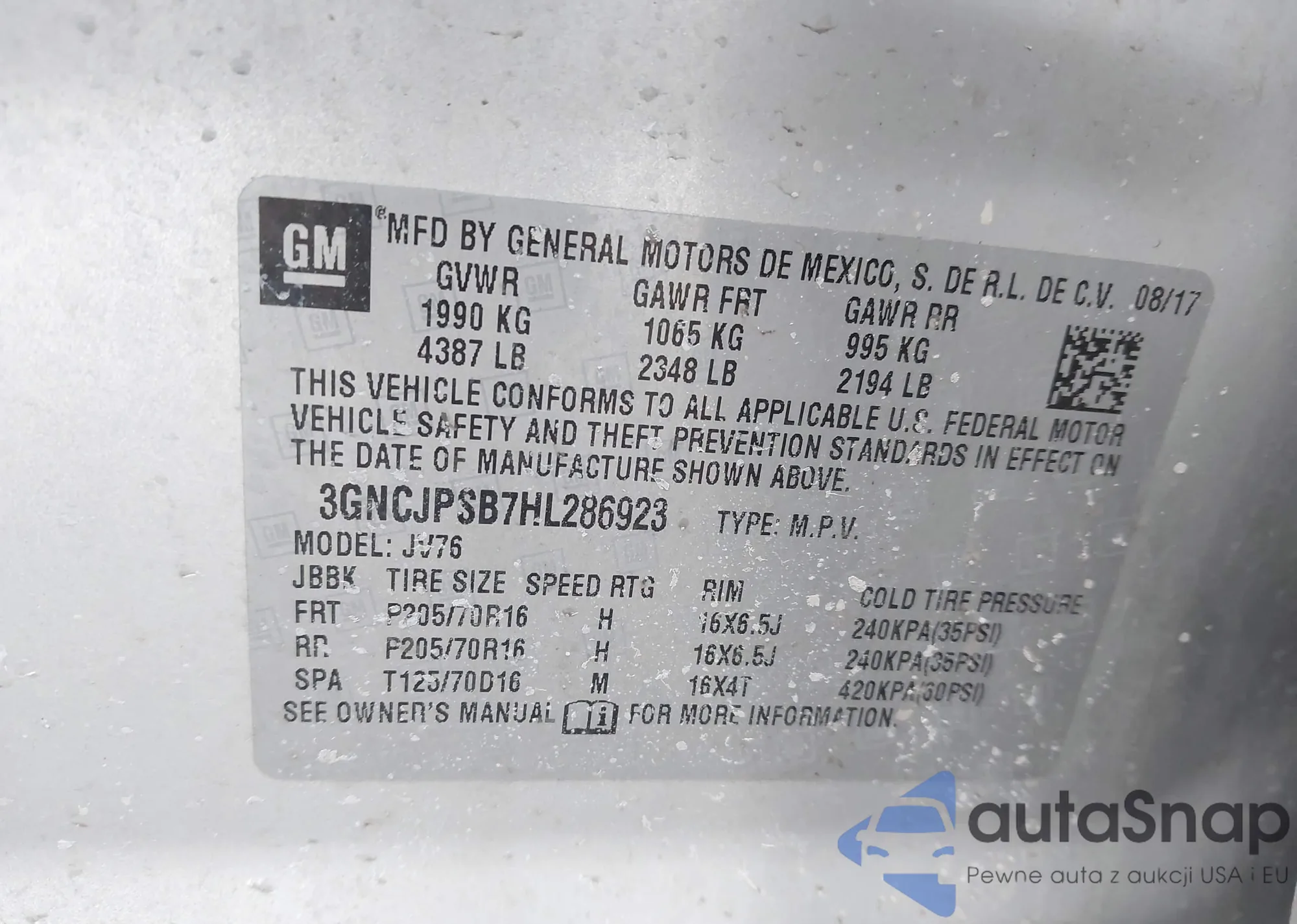 Автомобиль Chevrolet Trax 2017 (VIN 3GNCJPSB7HL286923) ранее не участвовал в торгах. Документы чистые, пробег соответствует или ниже среднего по рынку. Продаётся страховой компанией — рекомендуем покупку. Доставка в порт займет около 6–8 недель.