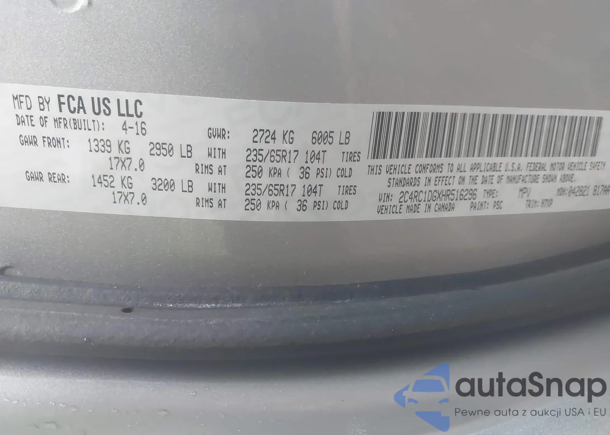 VIN: 2C4RC1DGXHR516296