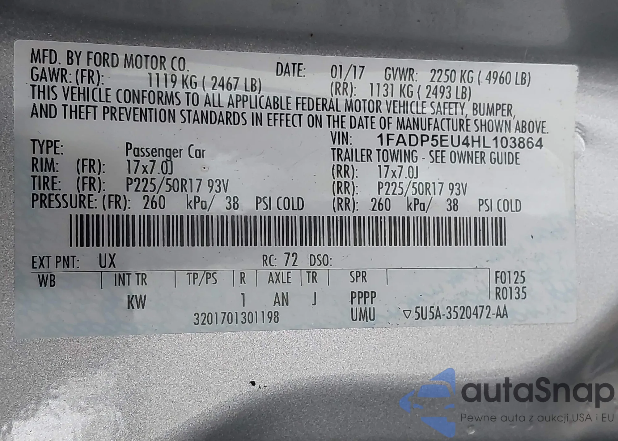 Автомобиль Ford C-MAX 2017 (VIN 1FADP5EU4HL103864) имеет документы, препятствующие регистрации. Могут возникнуть сложности при экспорте и регистрации. Обратитесь к экспертам AutaSnap для поиска альтернатив.