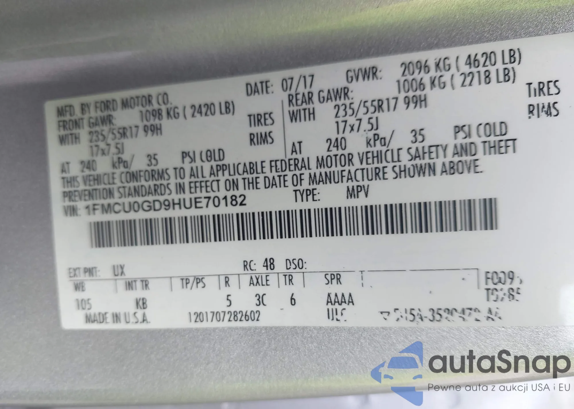 VIN: 1FMCU0GD9HUE70182