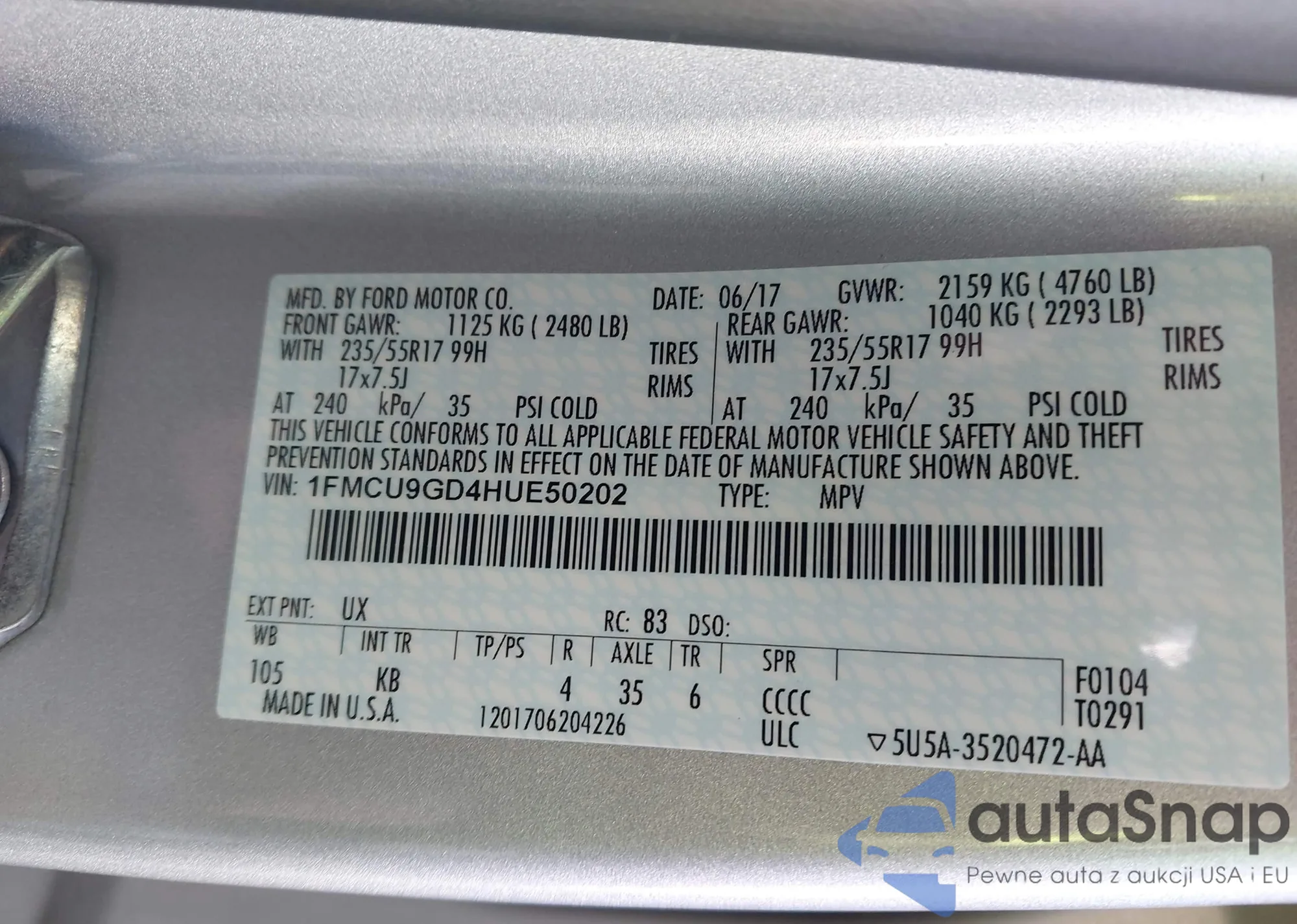 Автомобиль Ford Escape 2017 (VIN 1FMCU9GD4HUE50202) имеет документы, препятствующие регистрации. Могут возникнуть сложности при экспорте и регистрации. Обратитесь к экспертам AutaSnap для поиска альтернатив.