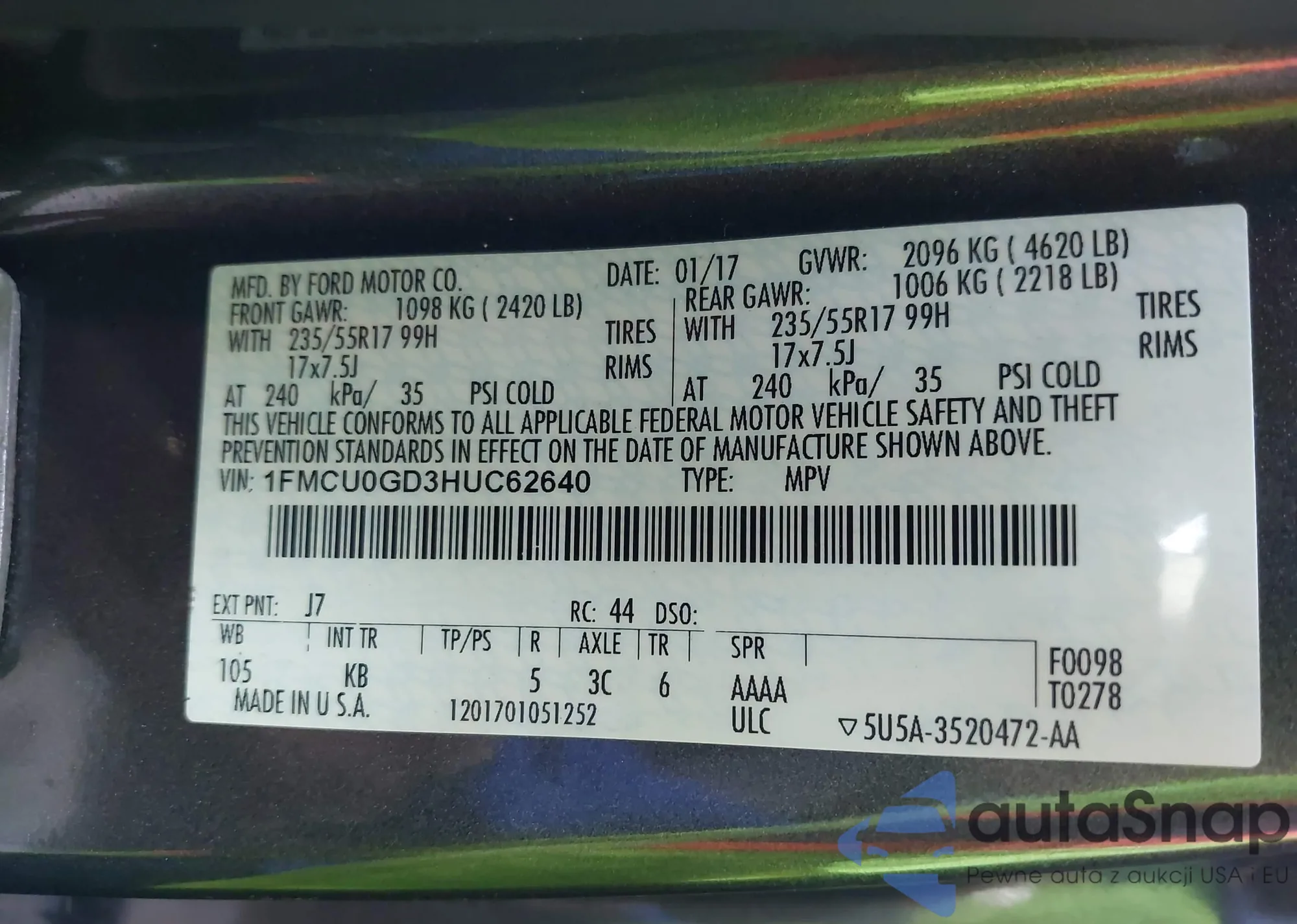 VIN: 1FMCU0GD3HUC62640