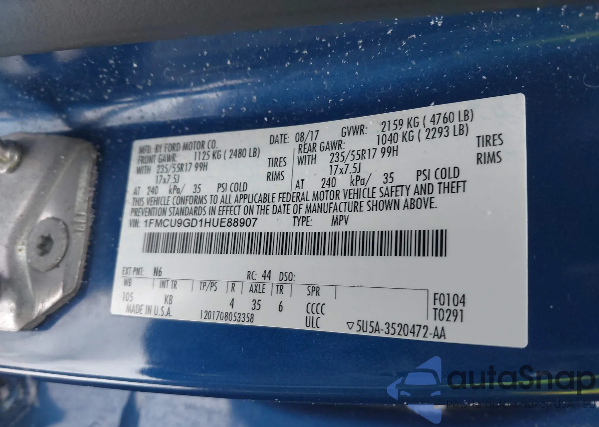 Автомобиль Ford Escape 2017 (VIN 1FMCU9GD1HUE88907) ранее не участвовал в торгах. Документы чистые, пробег соответствует или ниже среднего по рынку. Продаётся страховой компанией — рекомендуем покупку. Доставка в порт займет около 6–8 недель.
