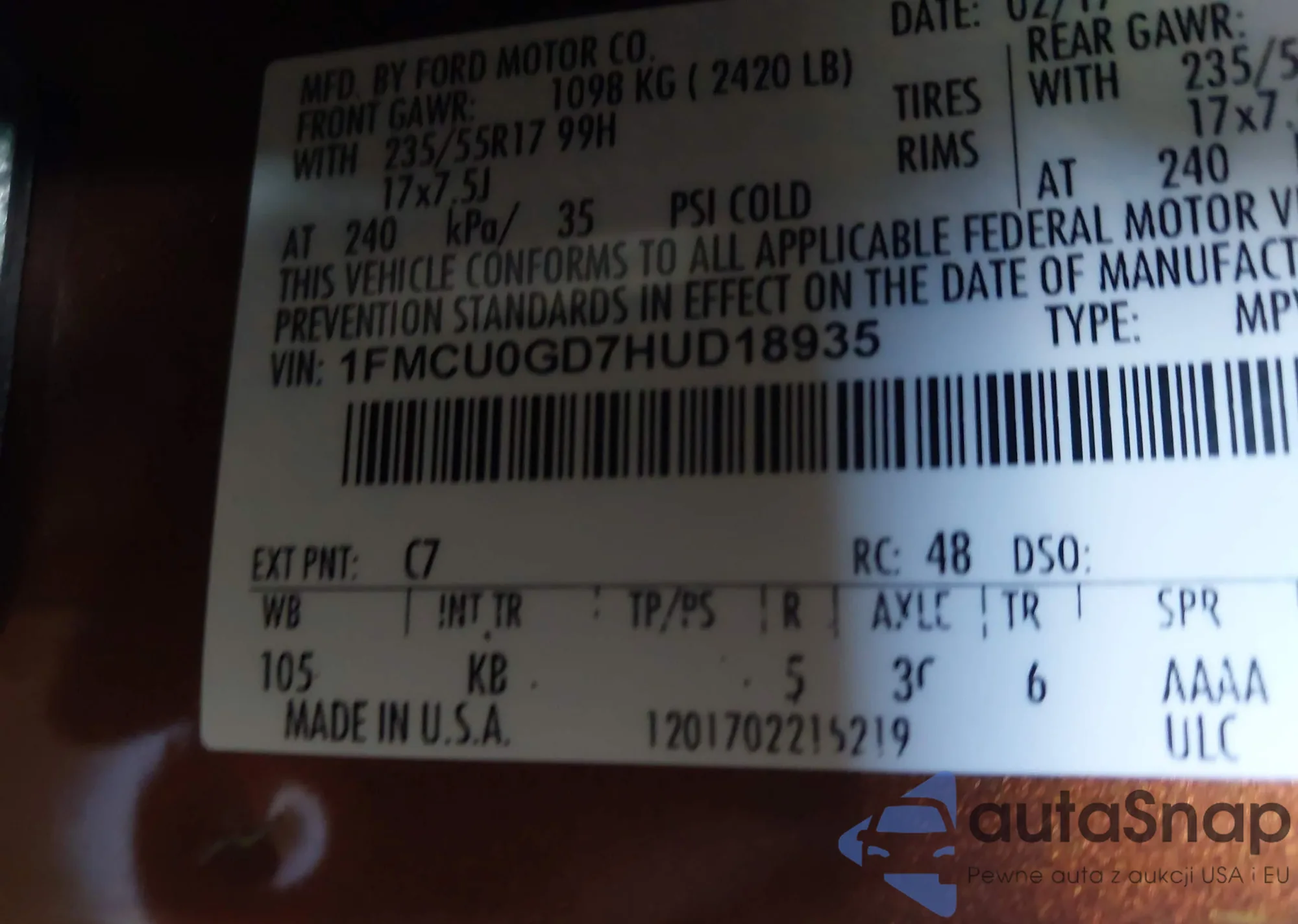 VIN: 1FMCU0GD7HUD18935