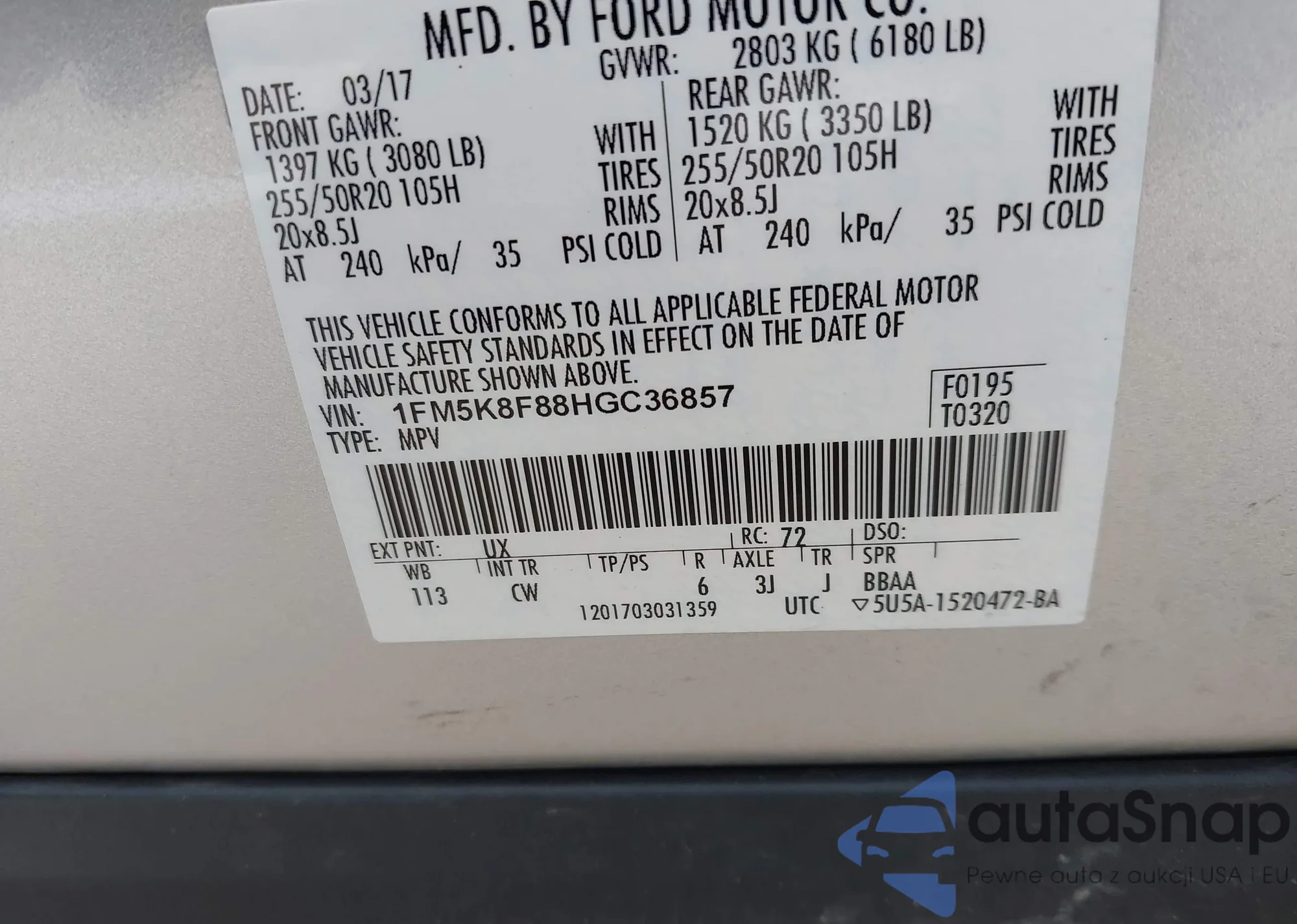 VIN: 1FM5K8F88HGC36857