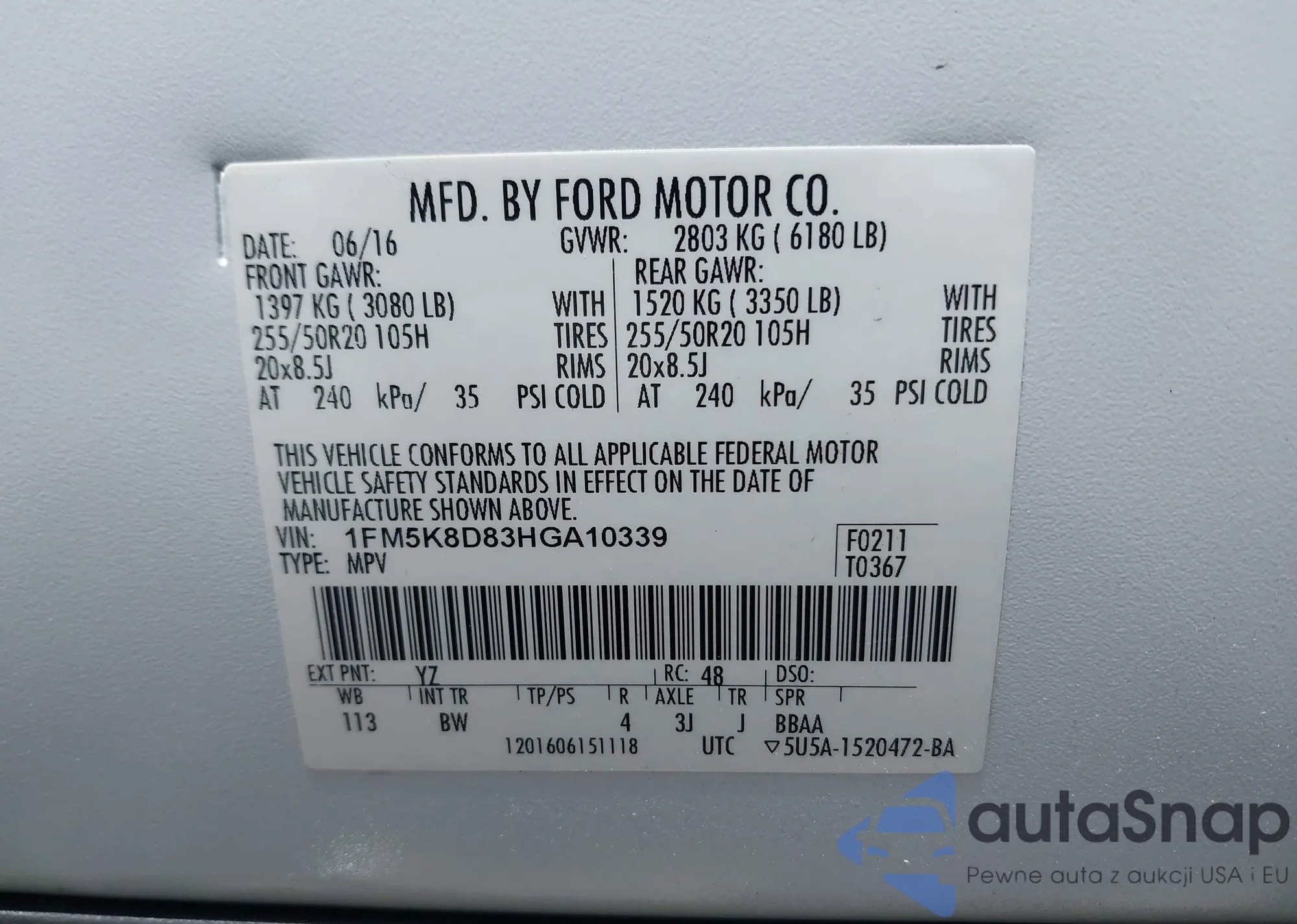 VIN: 1FM5K8D83HGA10339