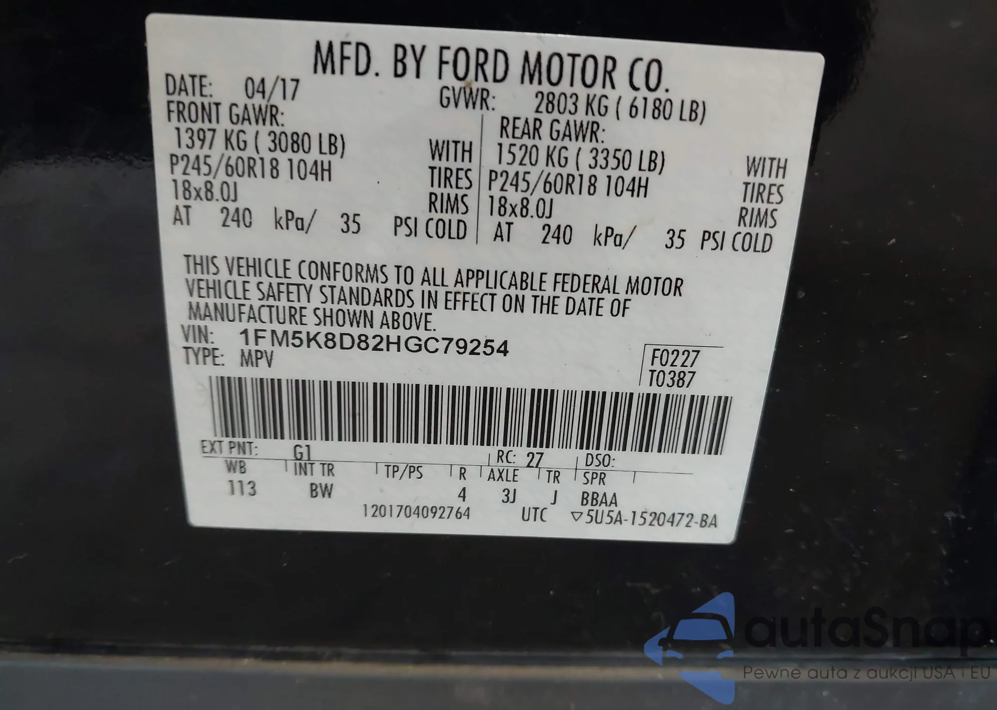 VIN: 1FM5K8D82HGC79254