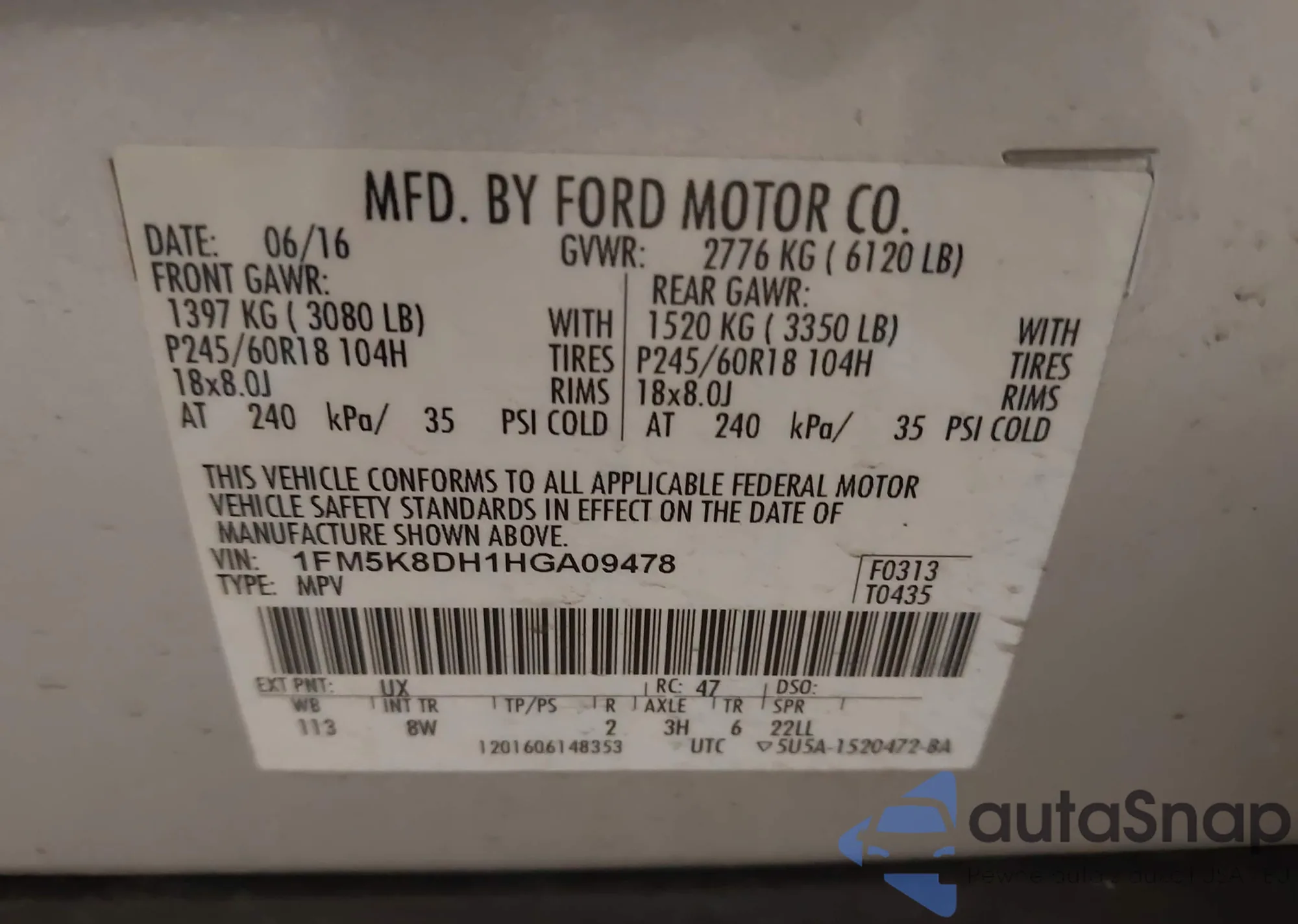 VIN: 1FM5K8DH1HGA09478