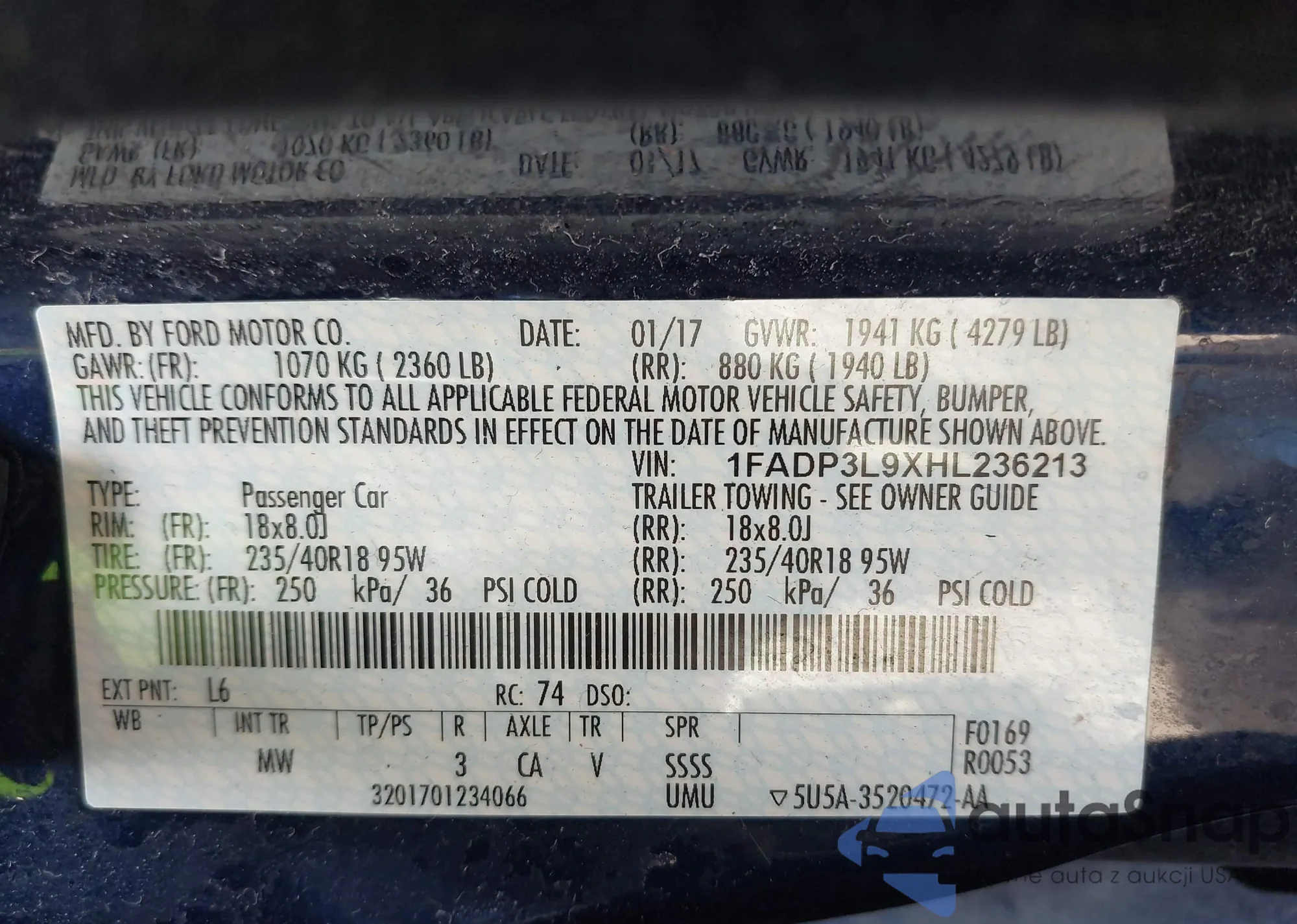 VIN: 1FADP3L9XHL236213