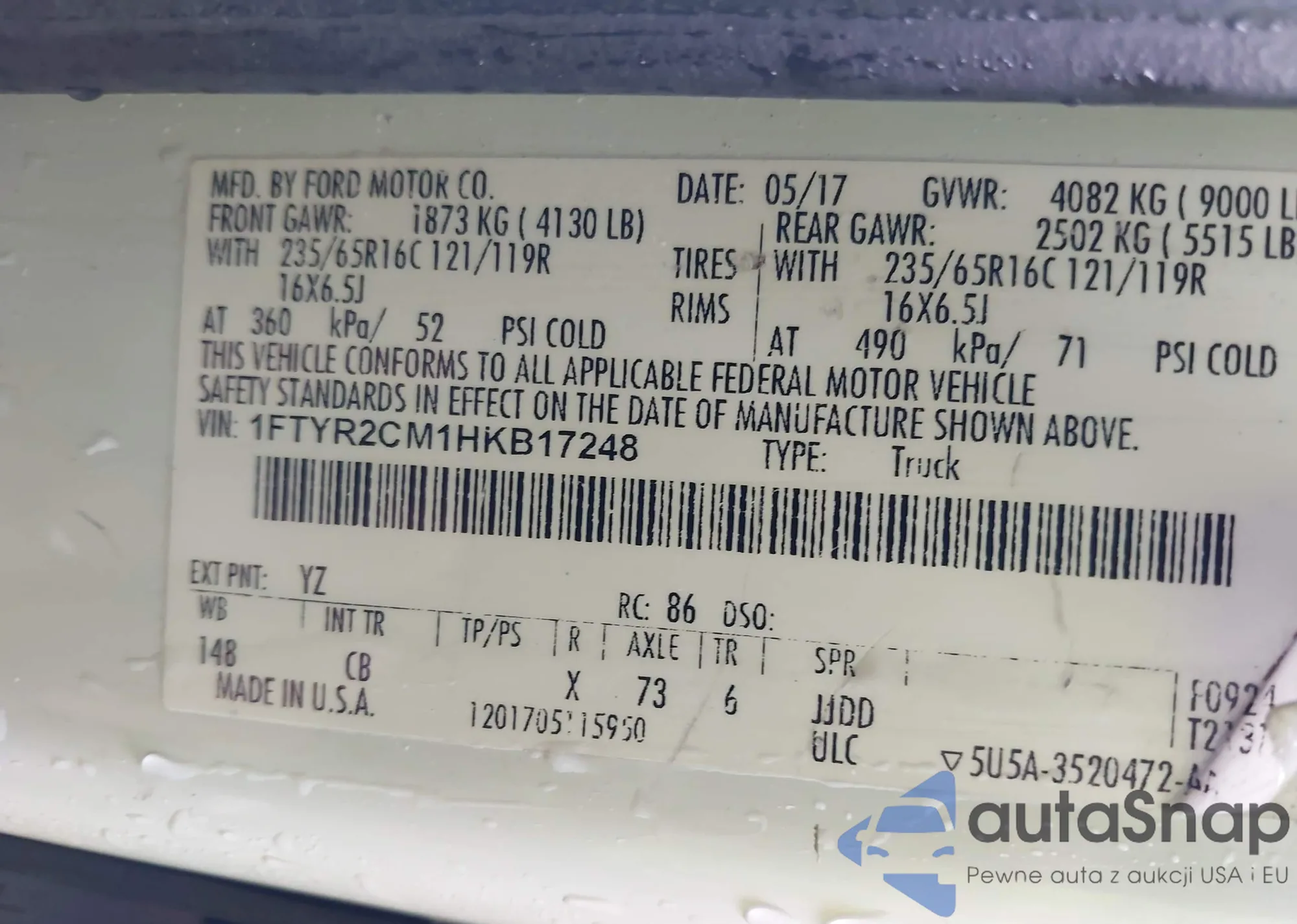Автомобиль Ford Transit 2017 (VIN 1FTYR2CM1HKB17248) ранее не участвовал в торгах. Документы чистые, пробег соответствует или ниже среднего по рынку. Продаётся страховой компанией — рекомендуем покупку. Доставка в порт займет около 6–8 недель.