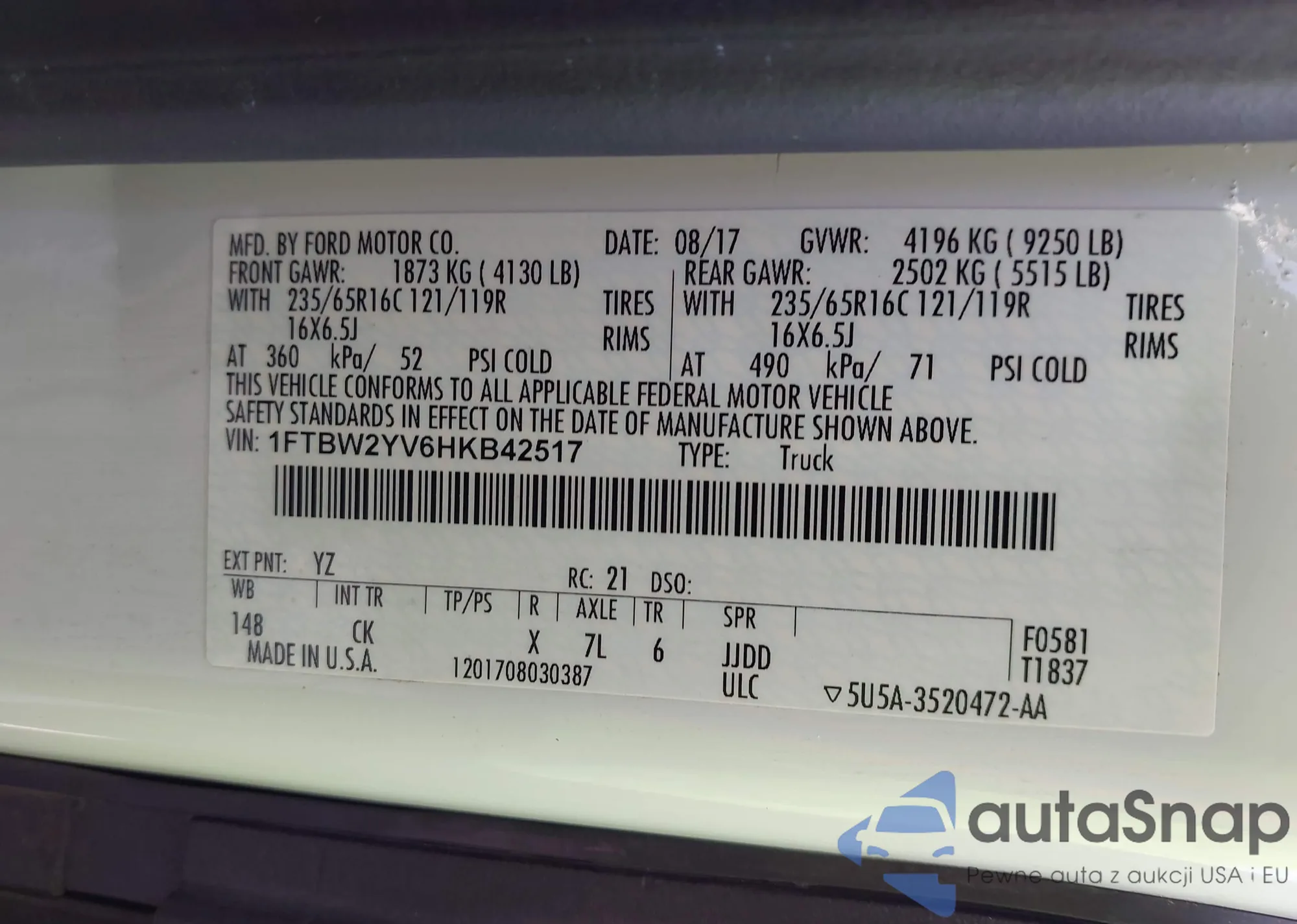 • VIN: 1FTBW2YV6HKB42517