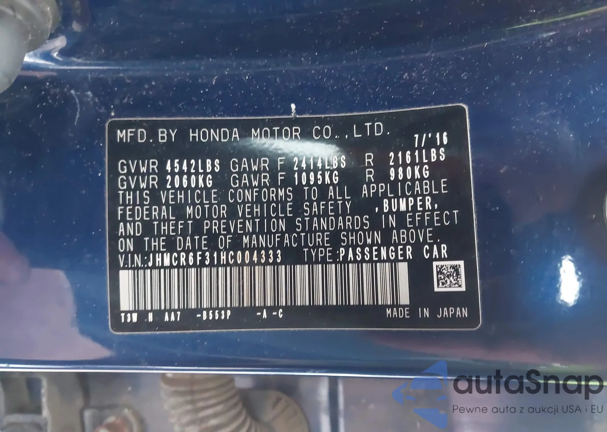 VIN: JHMCR6F31HC004333
