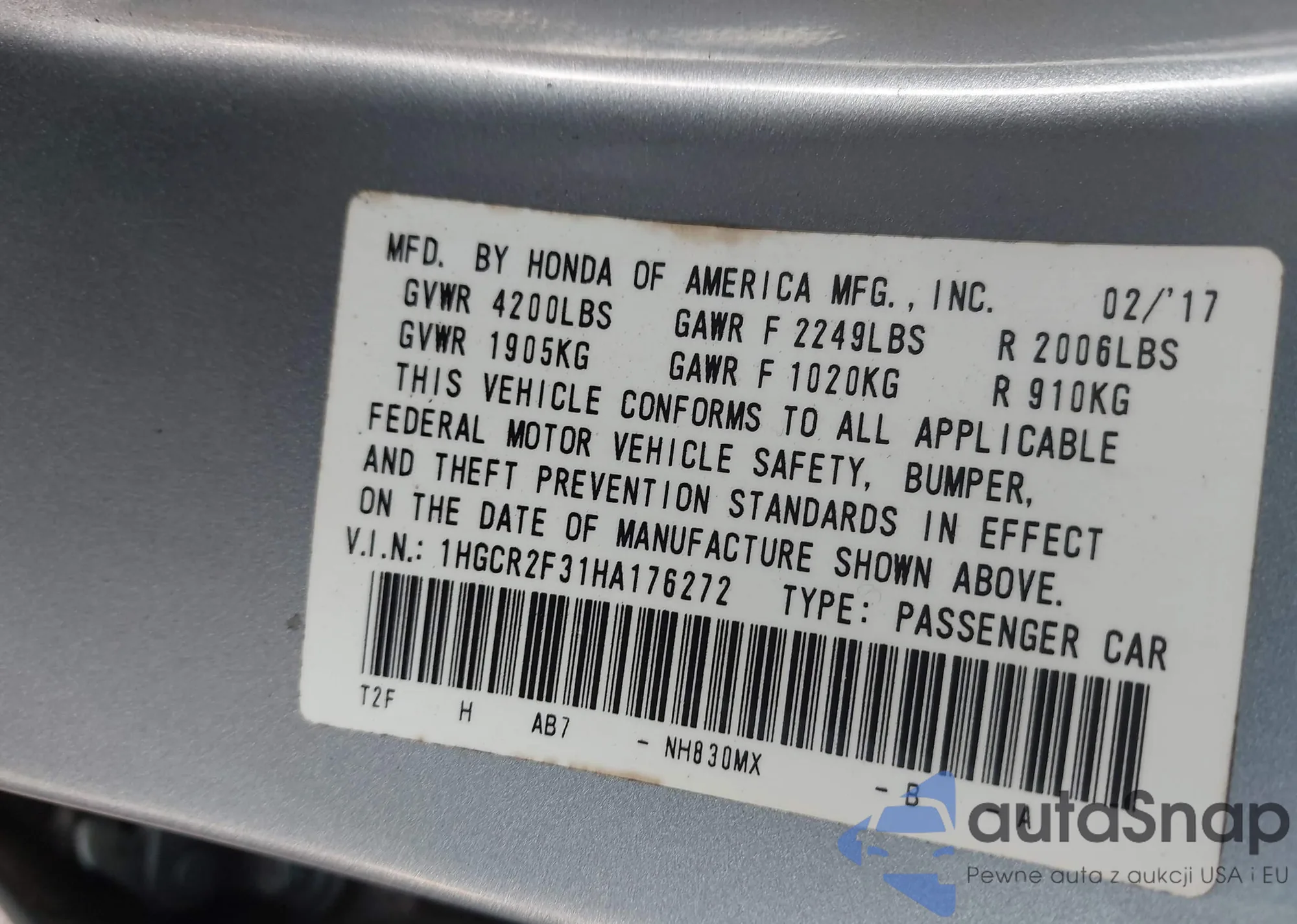 • VIN: 1HGCR2F31HA176272