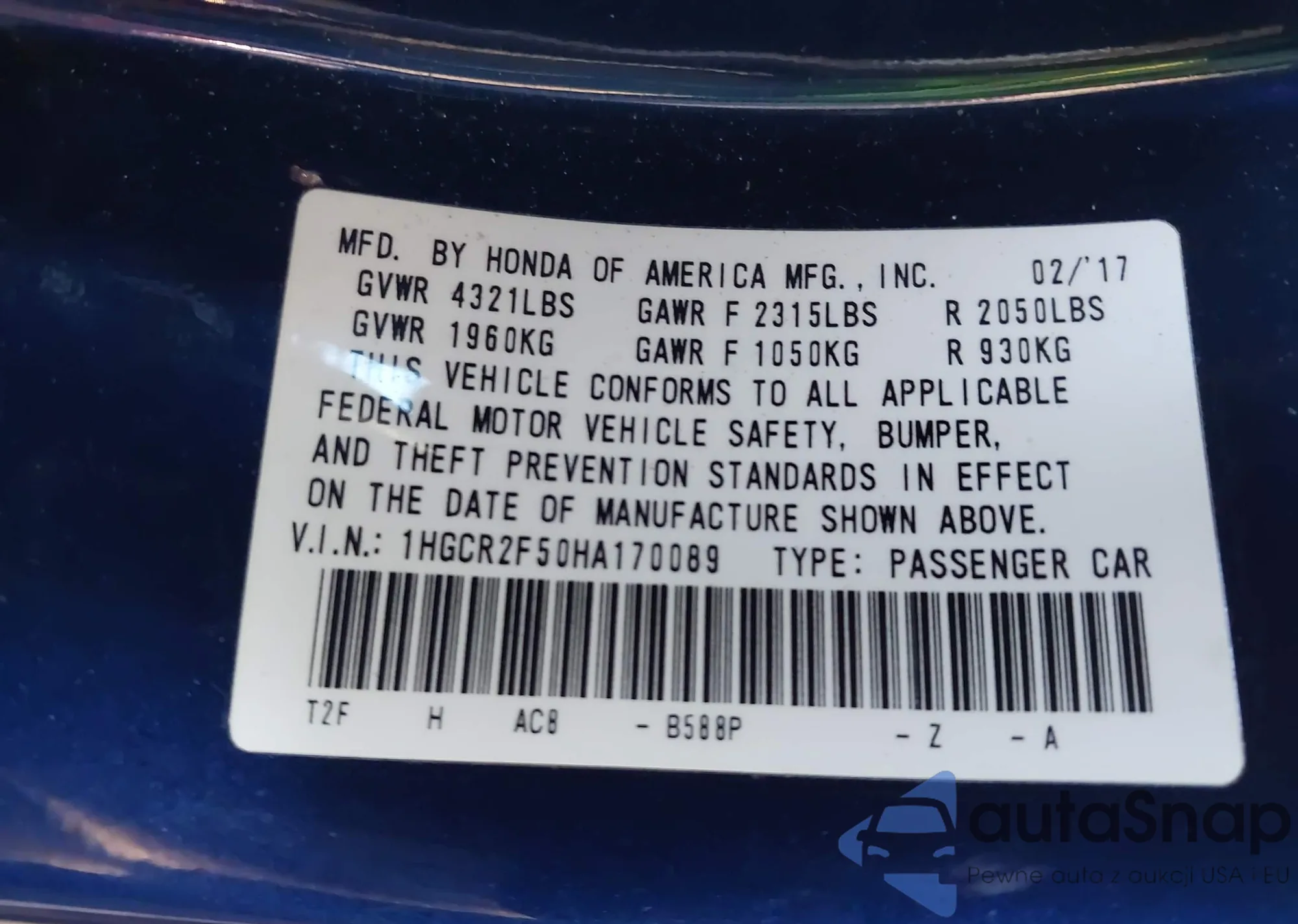 VIN: 1HGCR2F50HA170089