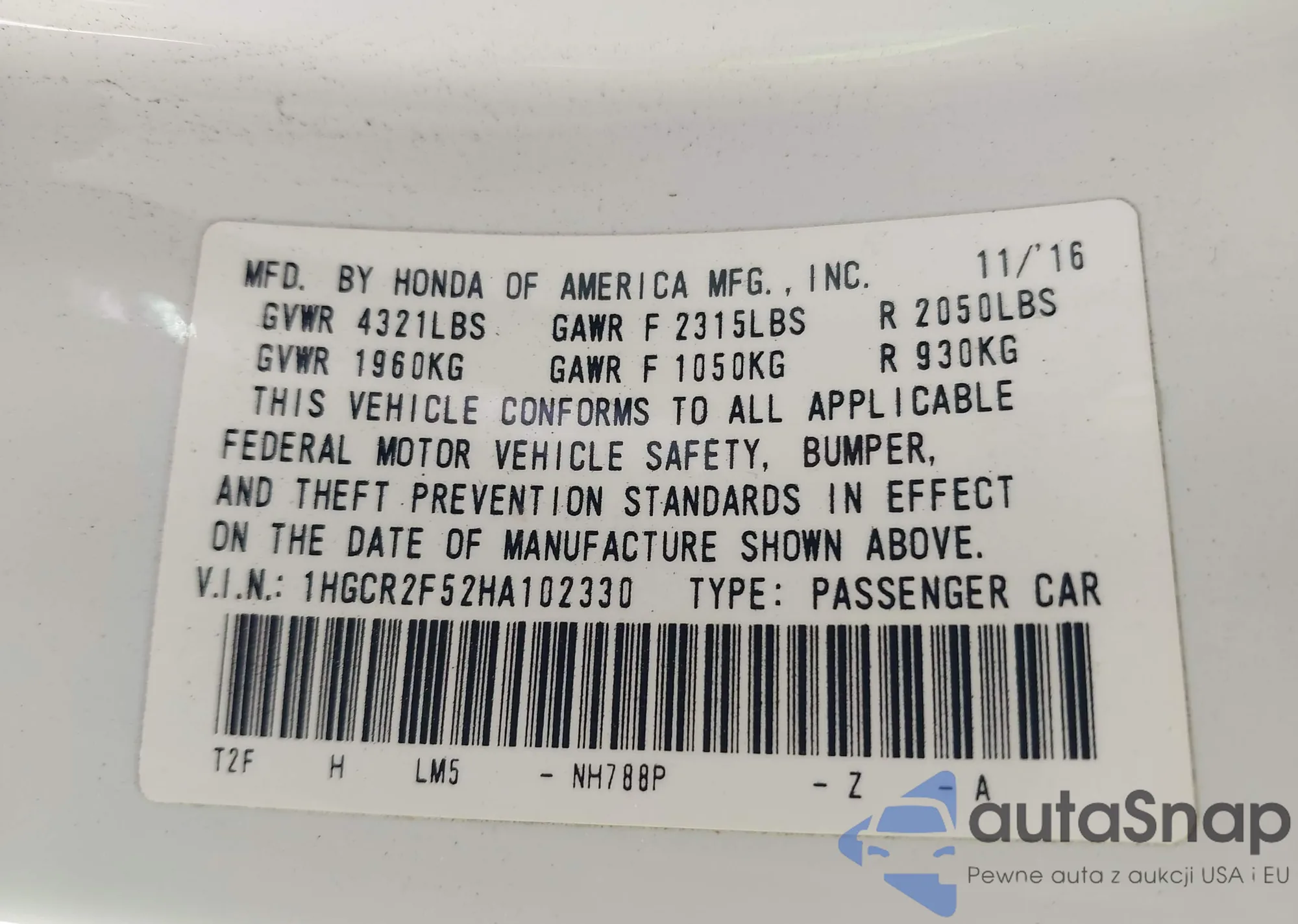 Автомобиль Honda Accord 2017 (VIN 1HGCR2F52HA102330) ранее не участвовал в торгах. Документы чистые, пробег соответствует или ниже среднего по рынку. Продаётся страховой компанией — рекомендуем покупку. Доставка в порт займет около 6–8 недель.