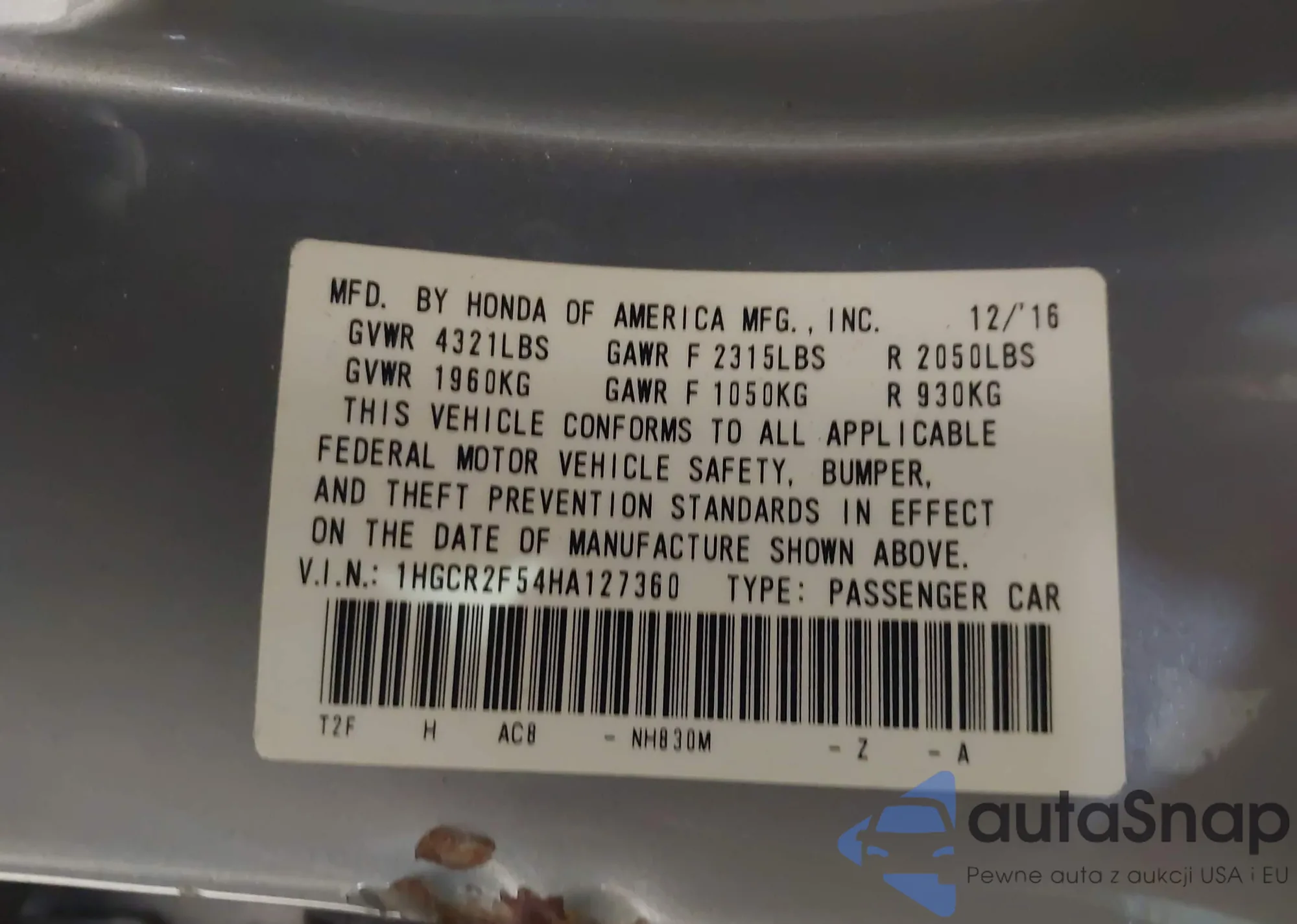 Автомобиль Honda Accord 2017 (VIN 1HGCR2F54HA127360) ранее не участвовал в торгах. Документы чистые, пробег соответствует или ниже среднего по рынку. Продаётся страховой компанией — рекомендуем покупку. Доставка в порт займет около 6–8 недель.