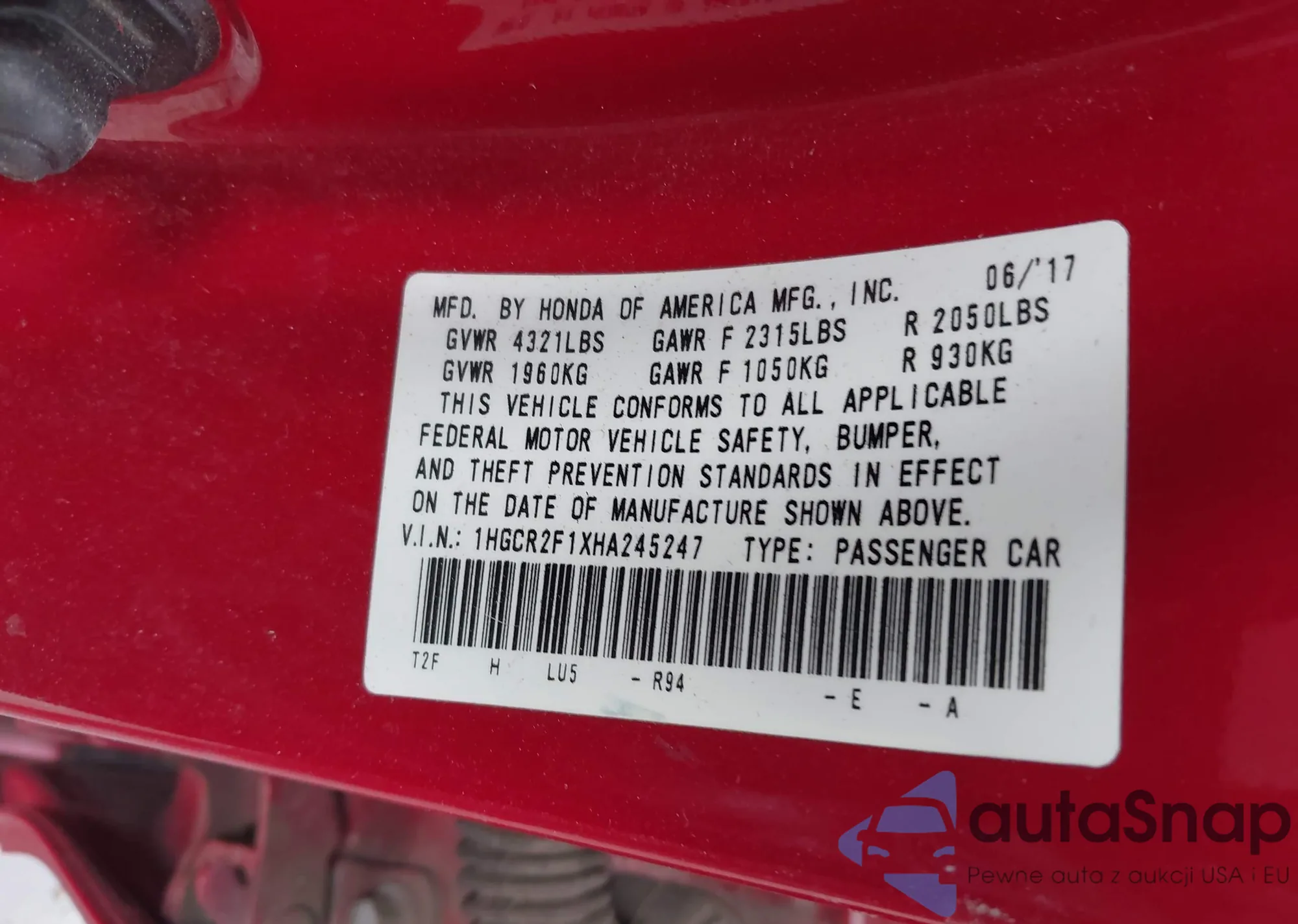 Автомобиль Honda Accord 2017 (VIN 1HGCR2F1XHA245247) ранее не участвовал в торгах. Документы чистые, пробег соответствует или ниже среднего по рынку. Продаётся страховой компанией — рекомендуем покупку. Доставка в порт займет около 6–8 недель.