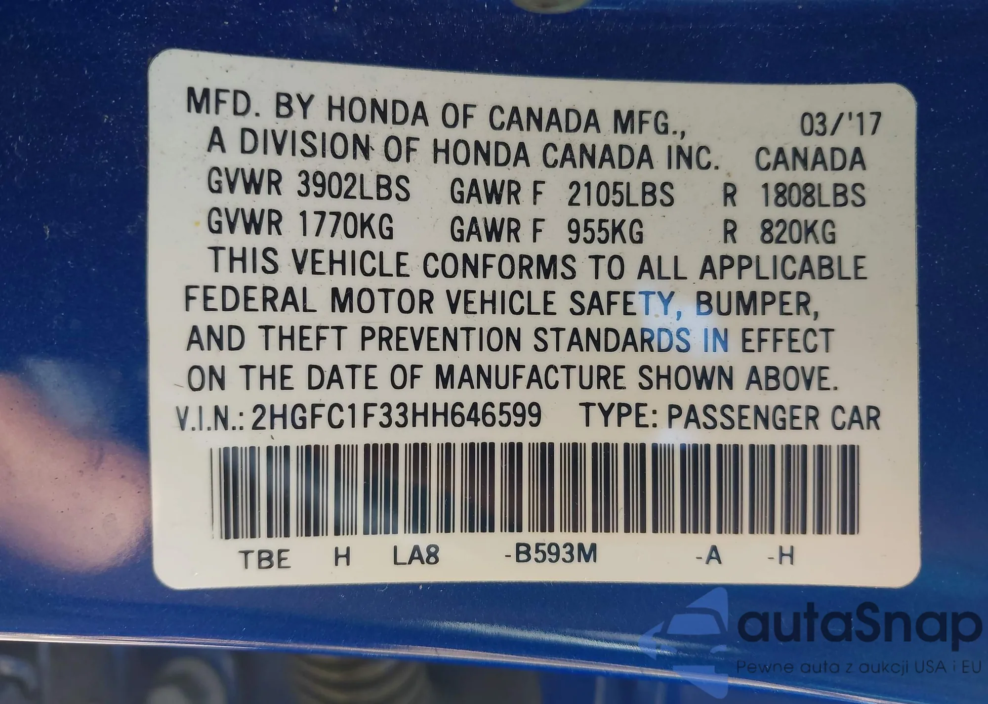 VIN: 2HGFC1F33HH646599
