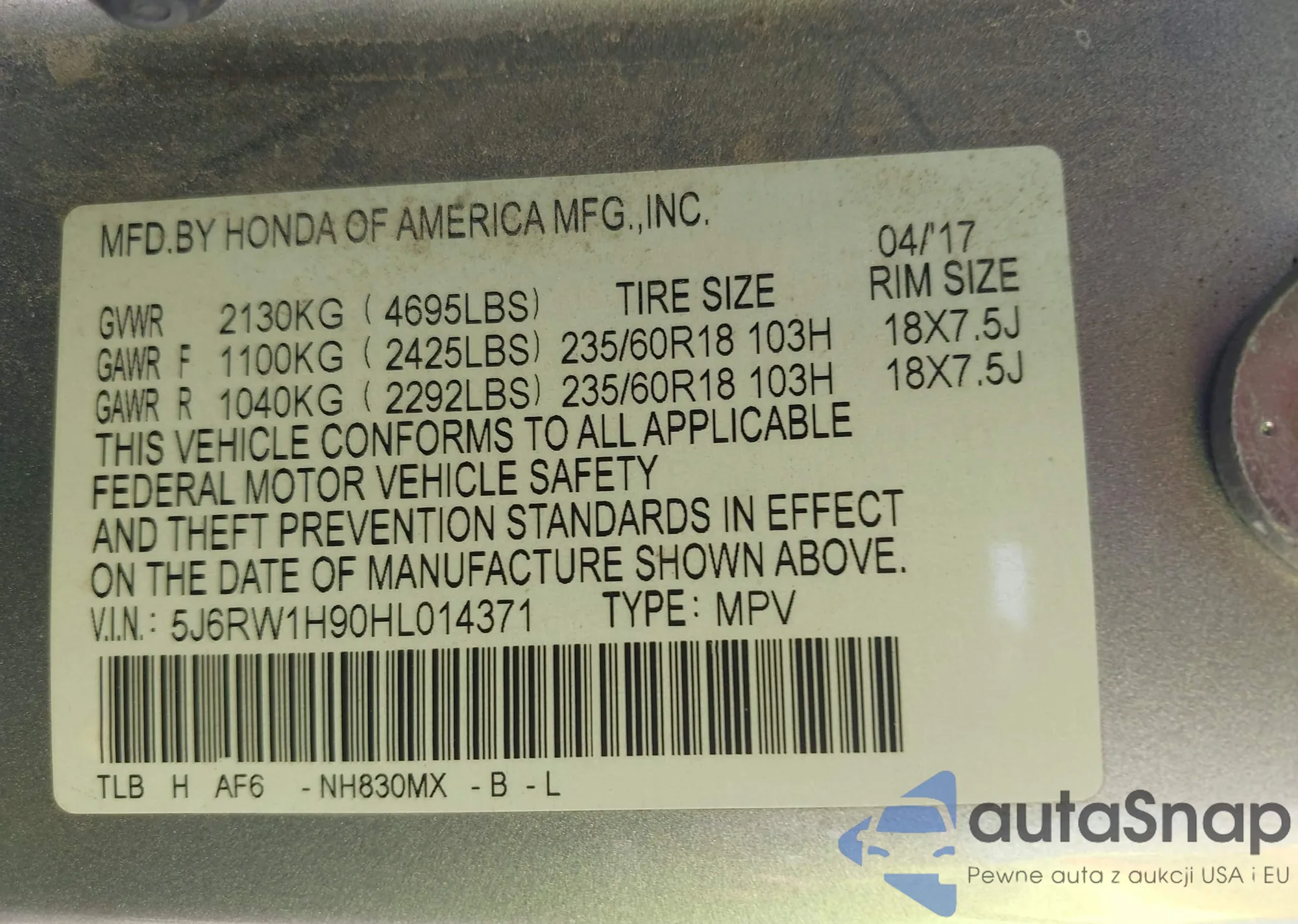 VIN: 5J6RW1H90HL014371