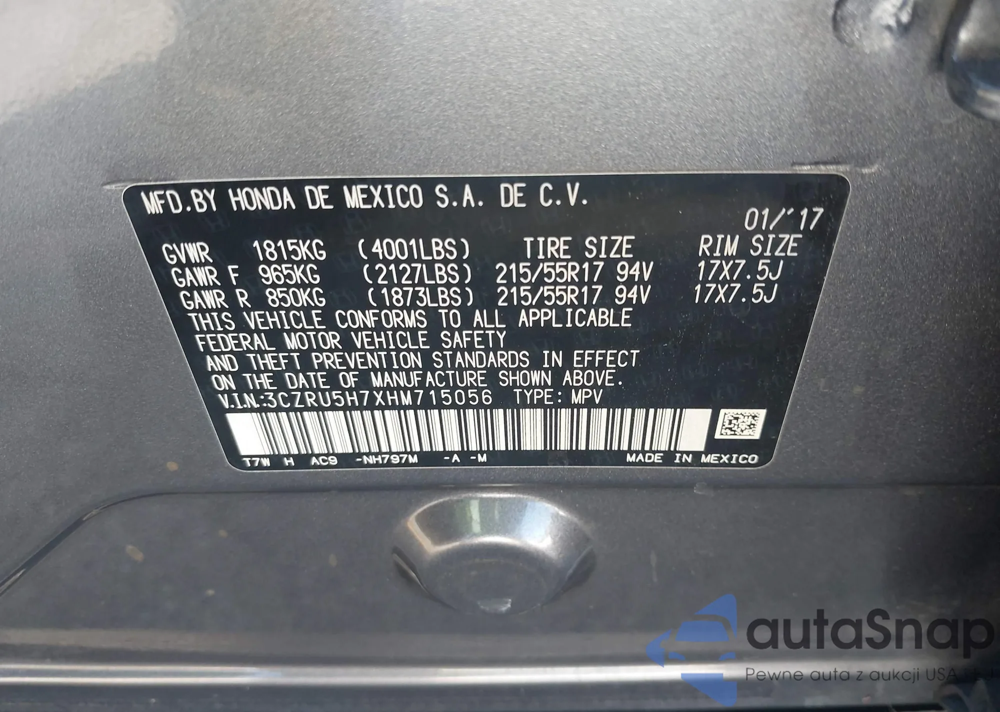 Автомобиль Honda HR-V 2017 (VIN 3CZRU5H7XHM715056) ранее не участвовал в торгах. Документы чистые, пробег соответствует или ниже среднего по рынку. Продаётся страховой компанией — рекомендуем покупку. Доставка в порт займет около 6–8 недель.