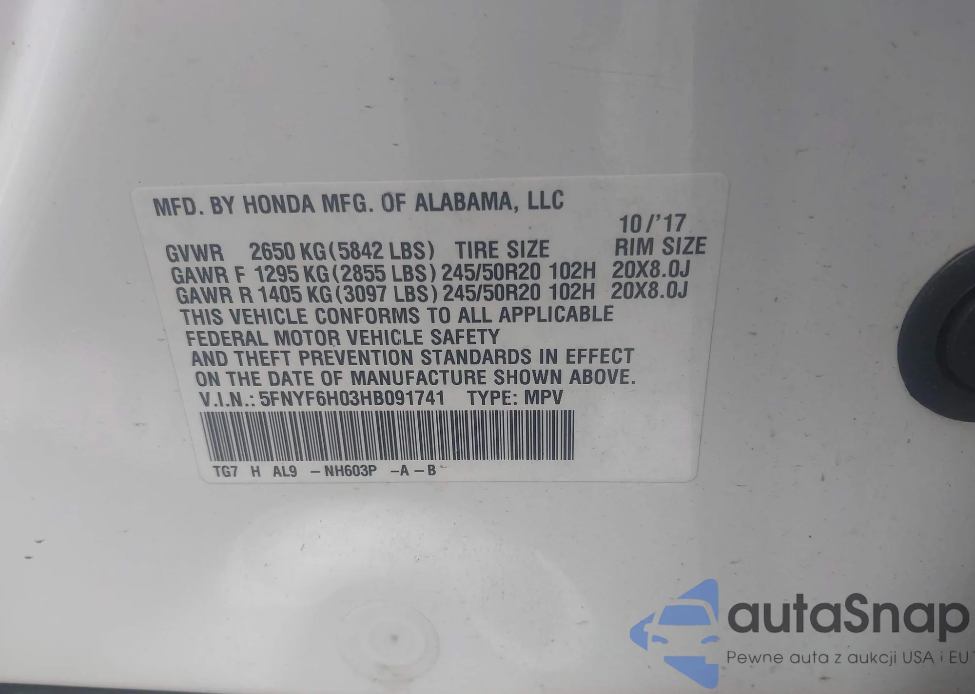 VIN: 5FNYF6H03HB091741