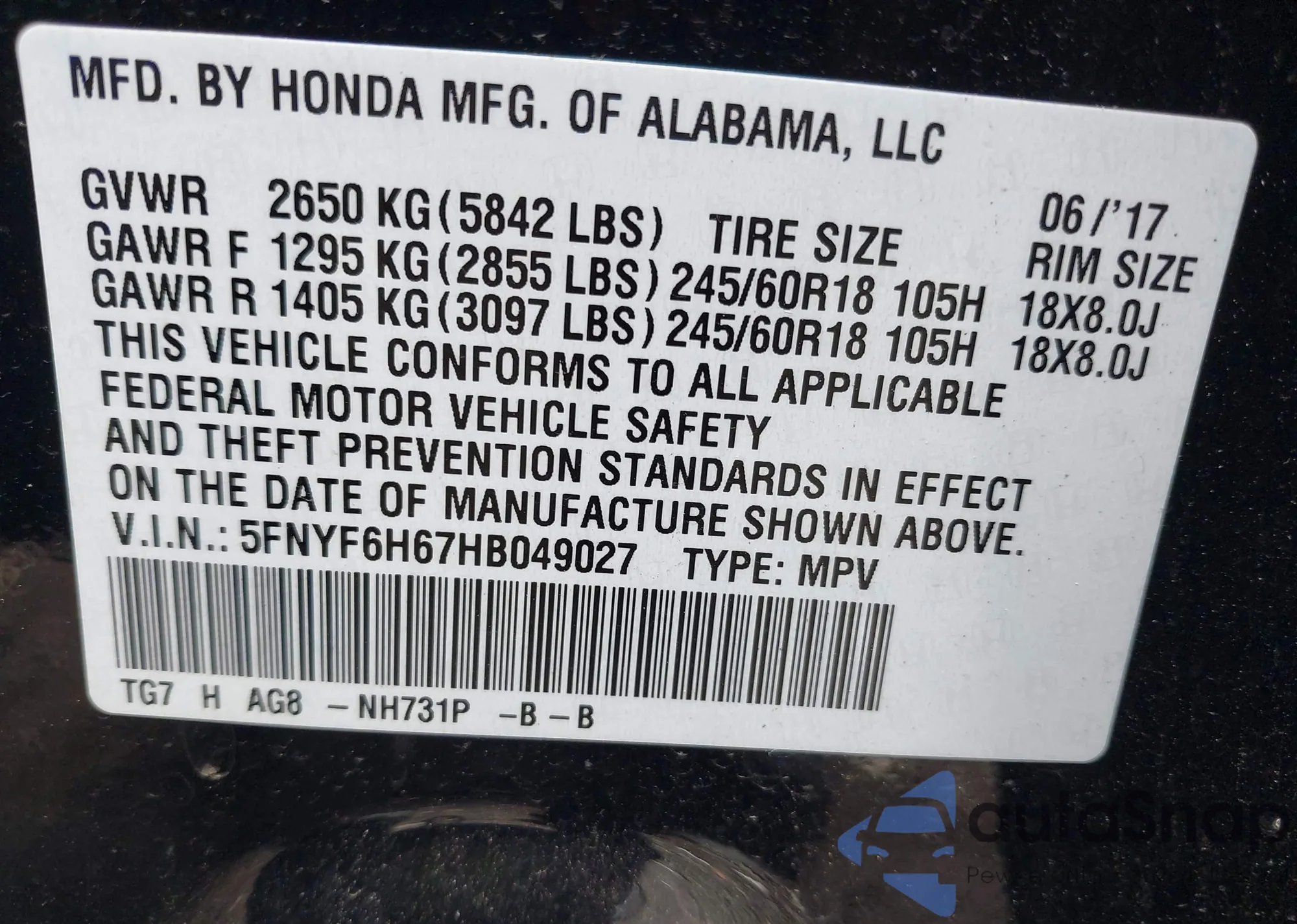 VIN: 5FNYF6H67HB049027