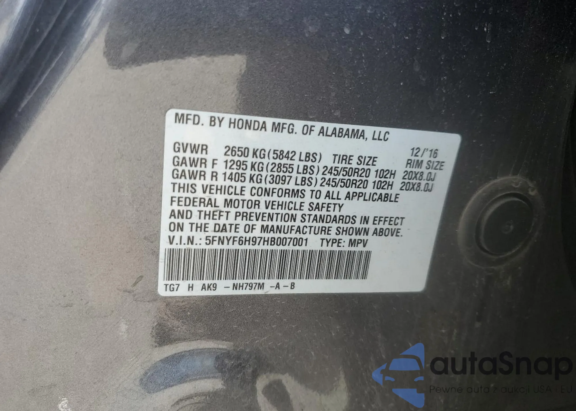 VIN: 5FNYF6H97HB007001