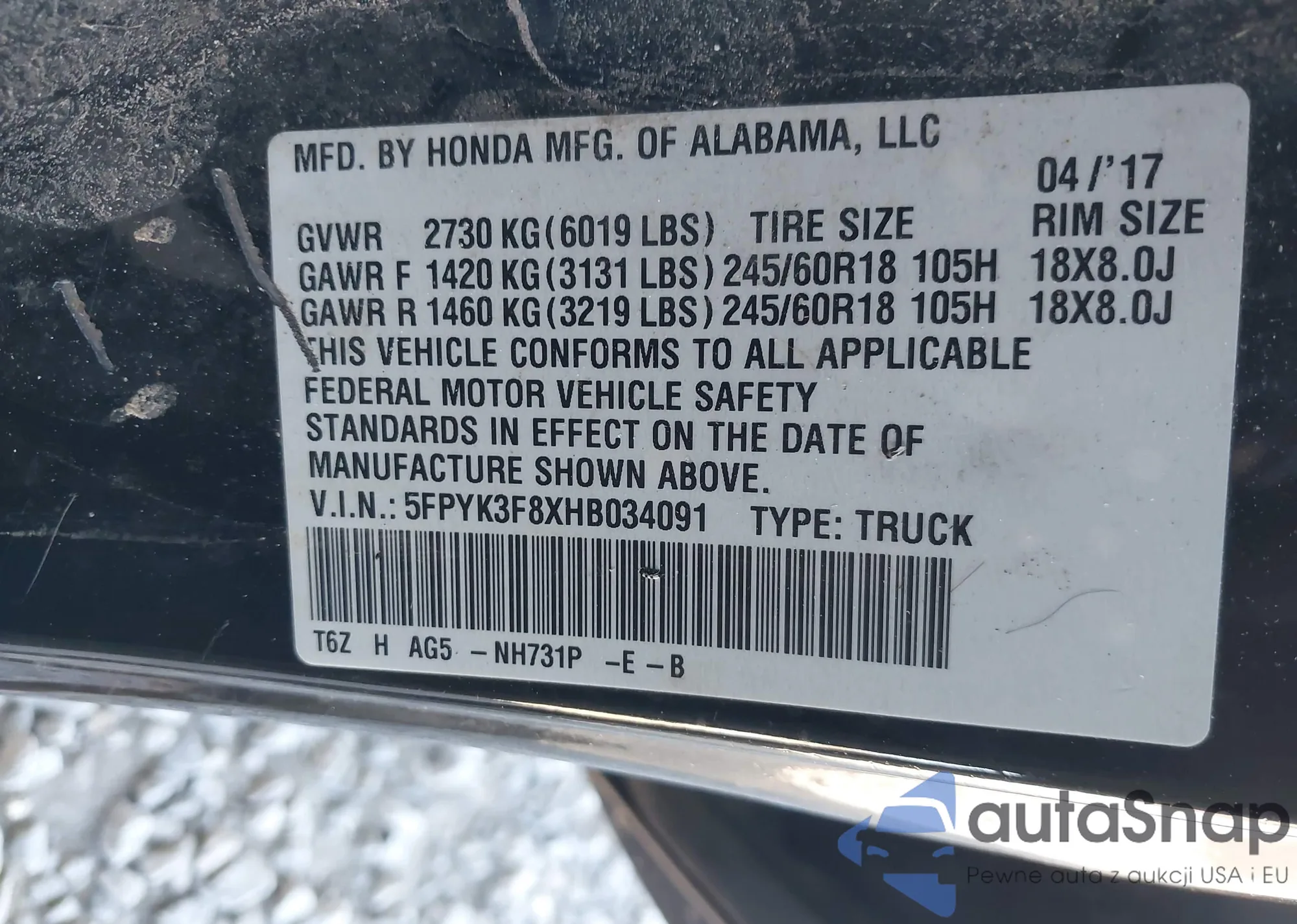 VIN: 5FPYK3F8XHB034091