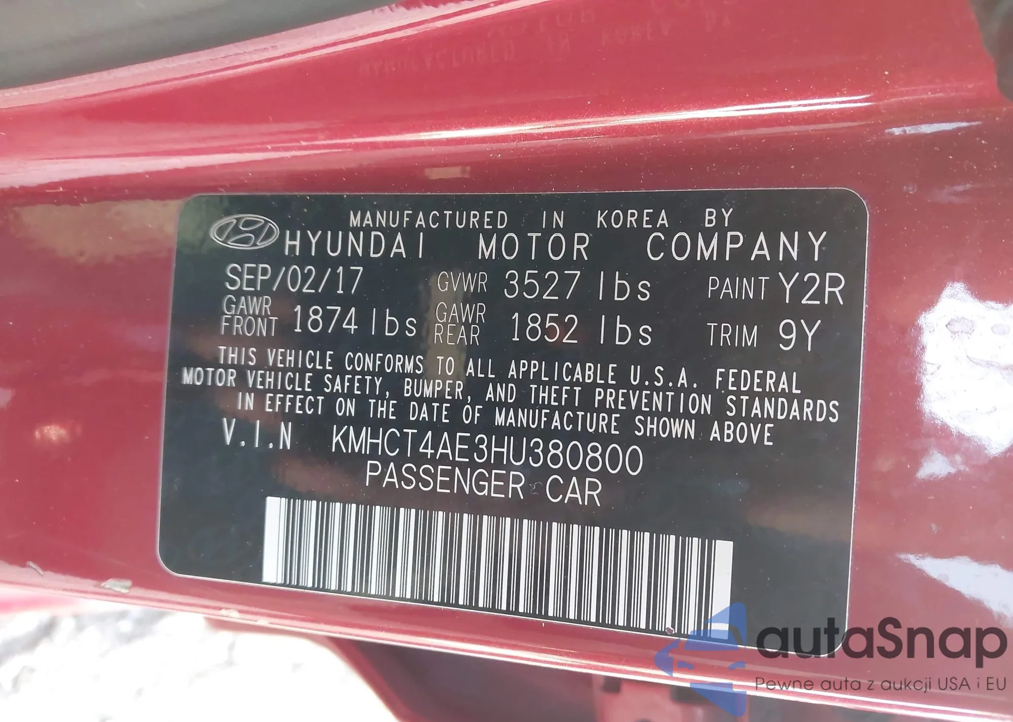 Автомобиль Hyundai Accent 2017 (VIN KMHCT4AE3HU380800) ранее не участвовал в торгах. Документы чистые, пробег соответствует или ниже среднего по рынку. Продаётся страховой компанией — рекомендуем покупку. Доставка в порт займет около 6–8 недель.