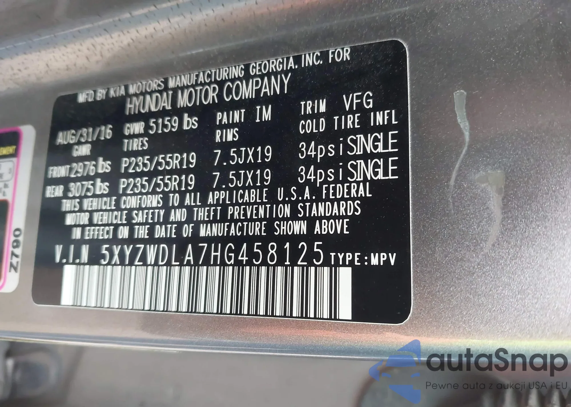 Автомобиль Hyundai Santa Fe 2017 (VIN 5XYZWDLA7HG458125) ранее не участвовал в торгах. Документы чистые, пробег соответствует или ниже среднего по рынку. Продаётся страховой компанией — рекомендуем покупку. Доставка в порт займет около 6–8 недель.