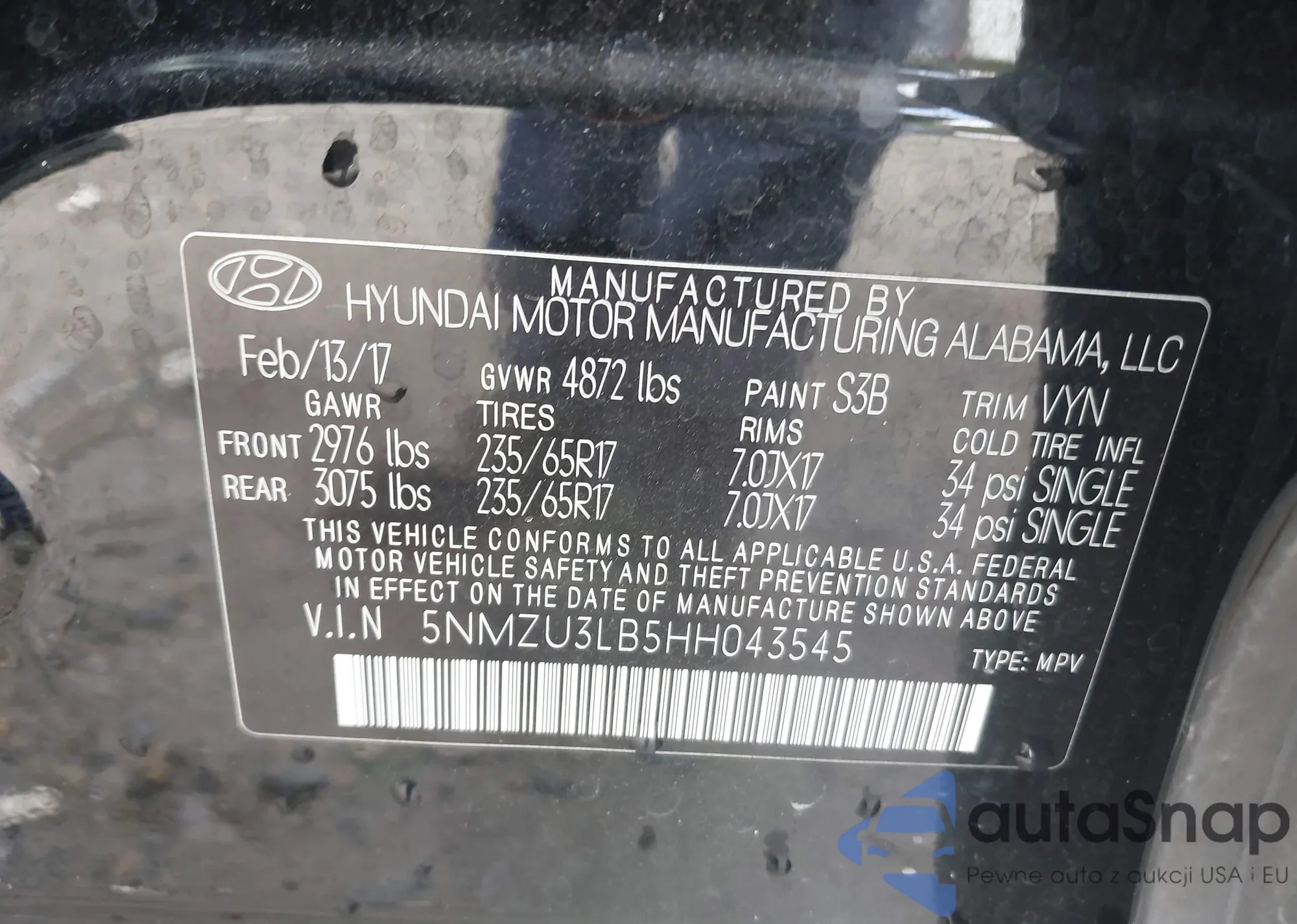 VIN: 5NMZU3LB5HH043545