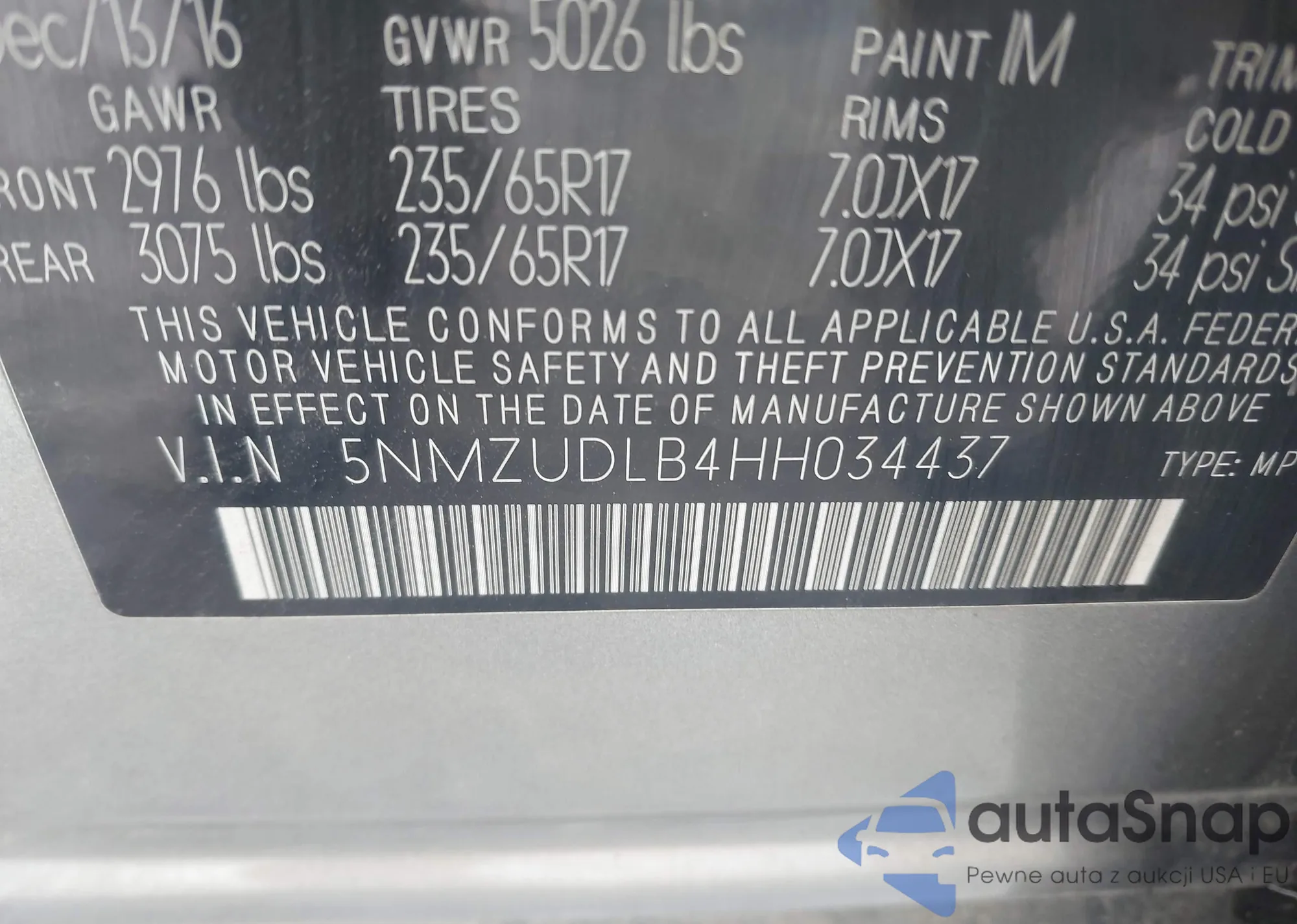 VIN: 5NMZUDLB4HH034437
